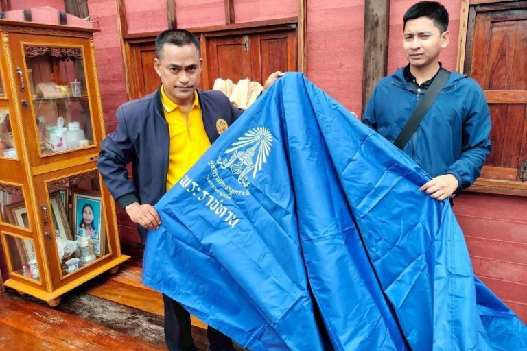 อำเภอโพธิ์ทองร่วมกับ อบต.หนองแม่ไก่ นำผ้าใบพระราชทานคลุมหลังคาบ้านของราษฎรที่ประสบวาตภัยในพื้นที่ตำบลหนองแม่ไก่