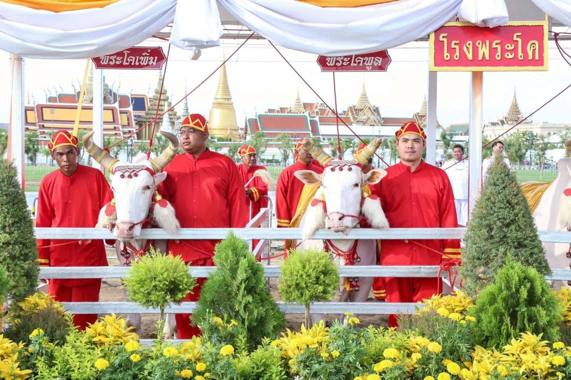 ส่วนพระโคแรกนาคือ พระโคพอและพระโคเพียง และมีพระโคสำรองคือ พระโคเพิ่มและพระโคพูล เสี่ยงทายของกิน ซึ่งประกอบด้วย ข้าว ข้าวโพด ถั่วเขียว งา เหล้า น้ำและหญ้า ทั้งนี้ หากพระโคกินข้าวหรือข้าวโพด พยากรณ์ว่า ธัญญาหาร ผลาหาร จะบริบูรณ์ดี, หากพระโคกินถั่วหรืองา พยากรณ์ว่า ผลาหาร ภักษาหาร จะอุดมสมบูรณ์ดี, หากพระโคกินน้ำหรือหญ้า พยากรณ์ว่า น้ำท่าจะบริบูรณ์พอสมควร ธัญญาหารผลาหาร ภักษาหาร มังสาหารจะอุดมสมบูรณ์ และหากพระโคกินเหล้า พยากรณ์ว่า การคมนาคมจะสะดวกขึ้น การค้าขายกับต่างประเทศดีขึ้น ทำให้เศรษฐกิจรุ่งเรือง