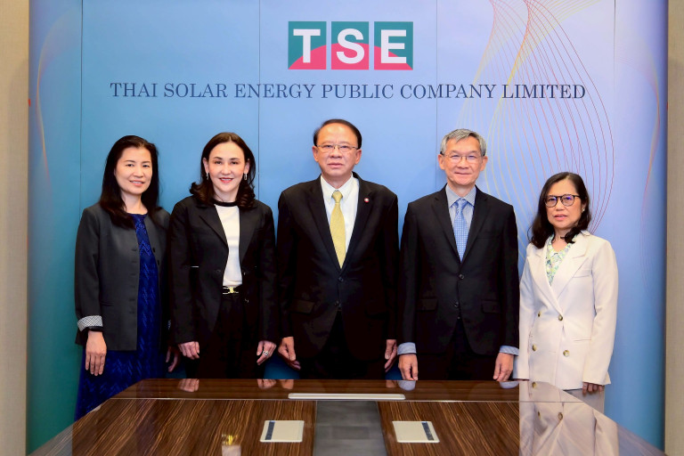 นายณรงค์ รัฐอมฤต ประธานกรรมการและกรรมการอิสระ, ดร.แคทลีน มาลีนนท์ ประธานเจ้าหน้าที่บริหาร, นางอังคณีย์ ฤกษ์ศิริสุข ประธานเจ้าหน้าที่ฝ่ายการเงิน และคณะกรรมการ บริษัท ไทย โซล่าร์ เอ็นเนอร์ยี่ จำกัด (มหาชน) (TSE) ถ่ายภาพร่วมกันภายหลังการประชุมสามัญผู้ถือหุ้นประจำปี 2568 ผ่านระบบสื่ออิเล็กทรอนิกส์(E-AGM) โดยที่ประชุมมีมติเห็นชอบทุกวาระ และอนุมัติเพิ่มทุนขายหุ้น PP จำนวน 211.77 ล้านหุ้น เพื่อใช้เป็นเงินทุนหมุนเวียนและขยายกิจการในอนาคต พร้อมอนุมัติขายหุ้น TSR สัดส่วน 60% รวมมูลค่า 1.79 พันล้านบาท ตามกลยุทธ์การปรับโครงสร้างบริหารจัดการโครงการลงทุนให้เกิดความเหมาะสม สร้างมูลค่าเพิ่มจากทรัพย์สินให้เกิดประโยชน์สูงสุดให้กับผู้ถือหุ้นในระยะยาว เพื่อสนับสนุนฐานะการเงินให้แข็งแกร่ง ซึ่งจะนำเงินไปขยายธุรกิจพลังงานสะอาด- Healthcare - Wellness สอดคล้องกับแผนธุรกิจสร้างการเติบโตมั่นคง และยั่งยืน โดยงานดังกล่าวจัดขึ้น ณ ห้องประชุมTSE