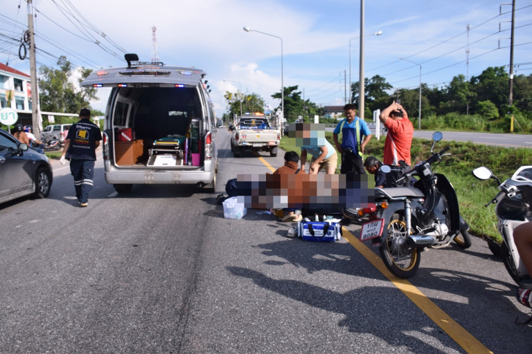ที่เกิดเหตุ กำลังอาสากู้ภัยและเวชกร สมาคมสว่างกตัญญูจันทบุรี ช่วยกันปฐมพยาบาลยื้อลมหายใจ หญิงสาววัยรุ่น ที่อยู่ในอาการบาดเจ็บสาหัส เสียเลือดมาก  ข้อเท้าขวาหัก นอนหมดสติหายใจรวยรินอยู่กลางถนน หลังขี่กำลังรถจักรยานยนต์ข้ามทาง ก่อนถูกรถยนต์เก๋งคู่กรณีที่ขับมาทางตรงพุ่งชนกระเด็นไกลเกือบ 60 -70 เมตร ก่อนรีบนำตัวส่งถ่ายทอด ให้กับรถโรงพยาบาลพระปกเกล้าระหว่างทาง เพื่อรับการรักษา