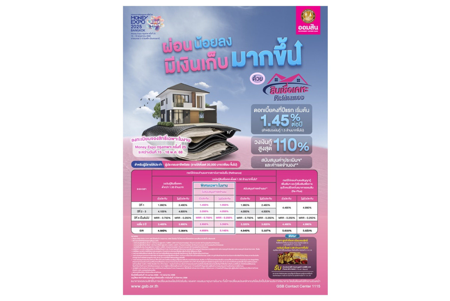 ส่วนผลิตภัณฑ์สินเชื่อเพื่อที่อยู่อาศัย ทั้งการซื้อ ปลูกสร้าง ต่อเติม ซ่อมแซม ไฮไลท์ด้วย สินเชื่อเคหะ Refinance ดอกเบี้ยคงที่ปีแรก เริ่มต้น 1.45% ต่อปี (สำหรับวงเงินกู้สินเชื่อตั้งแต่ 1.5 ล้านบาทขึ้นไป และผู้กู้ประสงค์ทำประกันฯ) เฉลี่ย 3 ปีต่ำสุด 2.85% ต่อปี ลงทะเบียนจองสิทธิ์ภายในงาน วงเงินกู้ตั้งแต่ 3 ล้านบาทขึ้นไป อนุมัติและทำนิติกรรมสัญญาแล้วเสร็จภายในวันที่ 31 กรกฎาคม 2568 สำหรับลูกค้า 99 รายแรก รับบัตรของขวัญ Central Gift Card มูลค่า 3,000 บาท นอกจากนี้ ยังมีผลิตภัณฑ์สินเชื่อเพื่อสร้างธุรกิจกับ สินเชื่อ GSB D-VERs เพื่อเป็นทุนหมุนเวียนในการดำเนินกิจการ ลงทุนในสินทรัพย์ถาวร หรือไถ่ถอนจำนองจากสถาบันการเงินอื่น ให้กู้ทั้งระยะสั้นและระยะยาว วงเงินเริ่มต้นตั้งแต่ 1 บาท สูงสุดไม่เกิน 100 ล้านบาท ทั้งนี้ วงเงินกู้ไม่เกิน 20 ล้านบาท สำหรับกรณีทำประกันชีวิตคุ้มครองวงเงินสินเชื่อและค้ำประกันเต็มวงเงินกู้ คิดอัตราดอกเบี้ย 2 ปีแรก = MOR/MLR-0.50% ปีที่ 3 เป็นต้นไป คิดอัตราดอกเบี้ย = MOR/MLR+0.25% แต่หากกู้ในวงเงินมากกว่า 20 - 100 ล้านบาท คิดอัตราดอกเบี้ย 2 ปีแรก = MOR/MLR-0.75% ปีที่ 3 เป็นต้นไป คิดอัตราดอกเบี้ย = MOR/MLR (ปัจจุบัน MOR ของธนาคาร = 6.345% และ MLR = 6.575%)