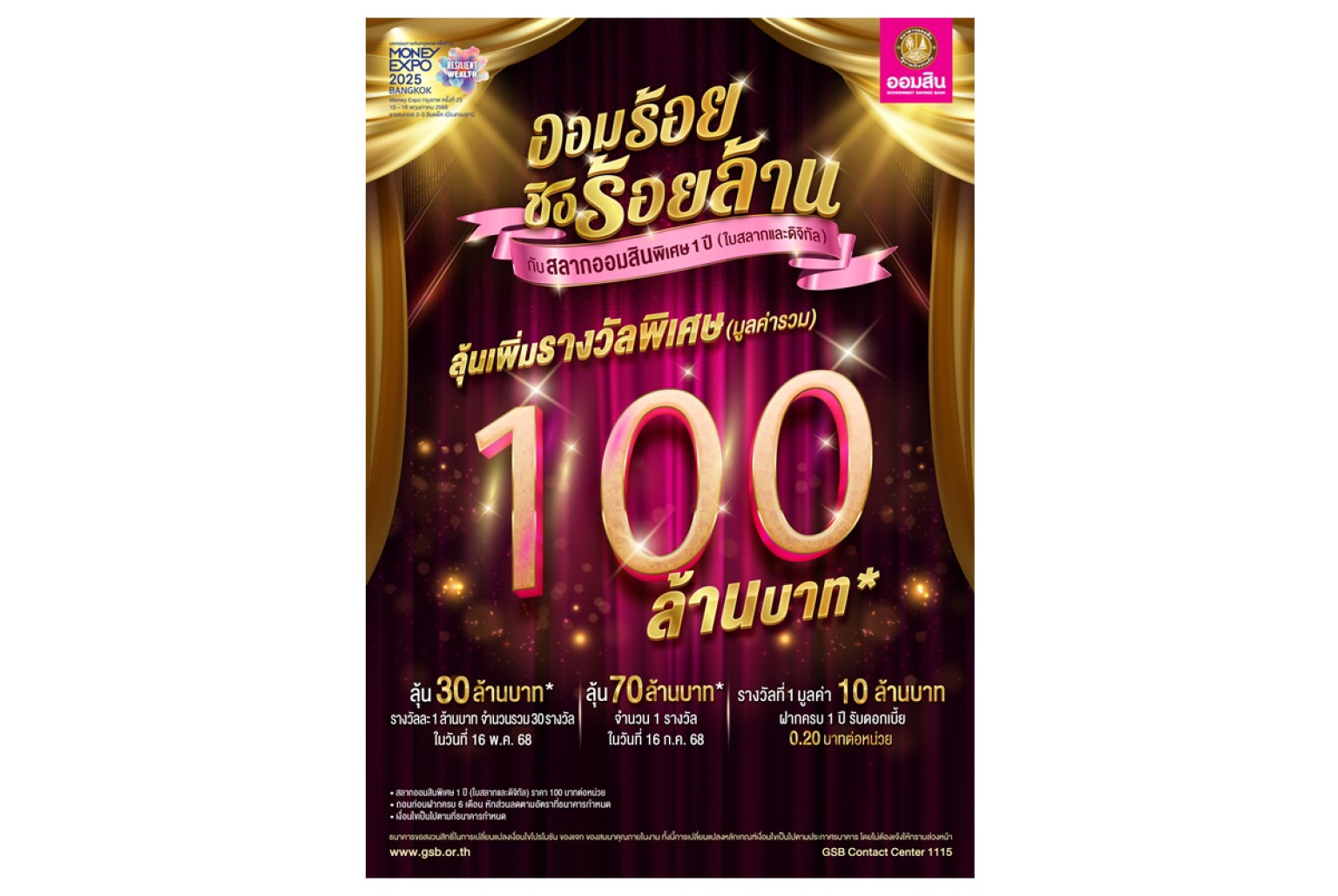 ธนาคารออมสิน เตรียมเข้าร่วมงานมหกรรมการเงินกรุงเทพ ครั้งที่ 25 Money Expo 2025 Bangkok โดยนำเสนอผลิตภัณฑ์ทางการเงินครบครัน พร้อมโปรโมชันสุดพิเศษเพื่อสร้างสังคมที่ดีไปด้วยกัน เริ่มต้นจากการสร้างการออมกับ เงินฝากเผื่อเรียกพิเศษ 99 วัน รับอัตราดอกเบี้ยแบบ Step up เฉลี่ย 2.55% ต่อปี หรือเทียบเท่าเงินฝากประจำ 3.00% ต่อปี จองสิทธิ์ภายในงาน จำนวนจำกัด วันละ 200 สิทธิ์ และ 1 คนต่อ 1 สิทธิ์ เปิดบัญชีขั้นต่ำ 10,000 บาท ฝากสูงสุด 500,000 บาทต่อราย ระยะเวลาฝากเงินระหว่างวันที่ 15 พ.ค. – 24 พ.ค. 68 ผู้ที่เปิดบัญชีรับกระปุกออมสิน GSB Green Power และโค้งสุดท้ายกับการลุ้นรางวัลใหญ่ครั้งแรกในแคมเปญแห่งปี “ออมร้อย ชิงร้อยล้าน” รางวัลพิเศษ มูลค่า 1 ล้านบาท งวดวันที่ 16 พฤษภาคม 2568 จำนวน 30 รางวัล และรางวัลพิเศษ มูลค่า 70 ล้านบาท งวดวันที่ 16 กรกฎาคม 2568 เพียง 1 รางวัลเท่านั้น มูลค่ารางวัลพิเศษรวม 100 ล้านบาท สำหรับผู้ฝากสลากออมสินพิเศษ 1 ปี ตั้งแต่ 100 บาทขึ้นไป ระหว่างวันที่ 1 เมษายน – 15 กรกฎาคม 2568