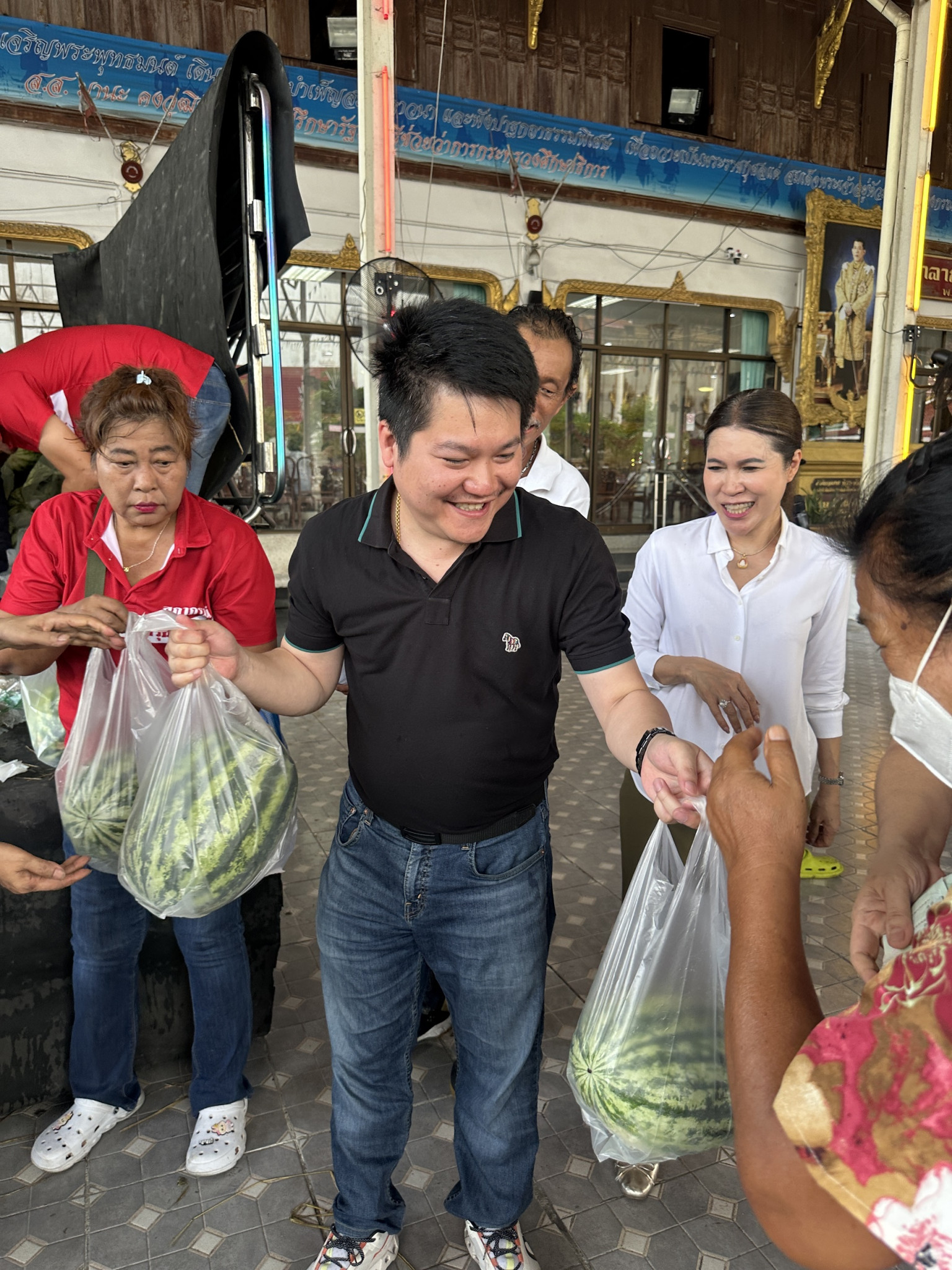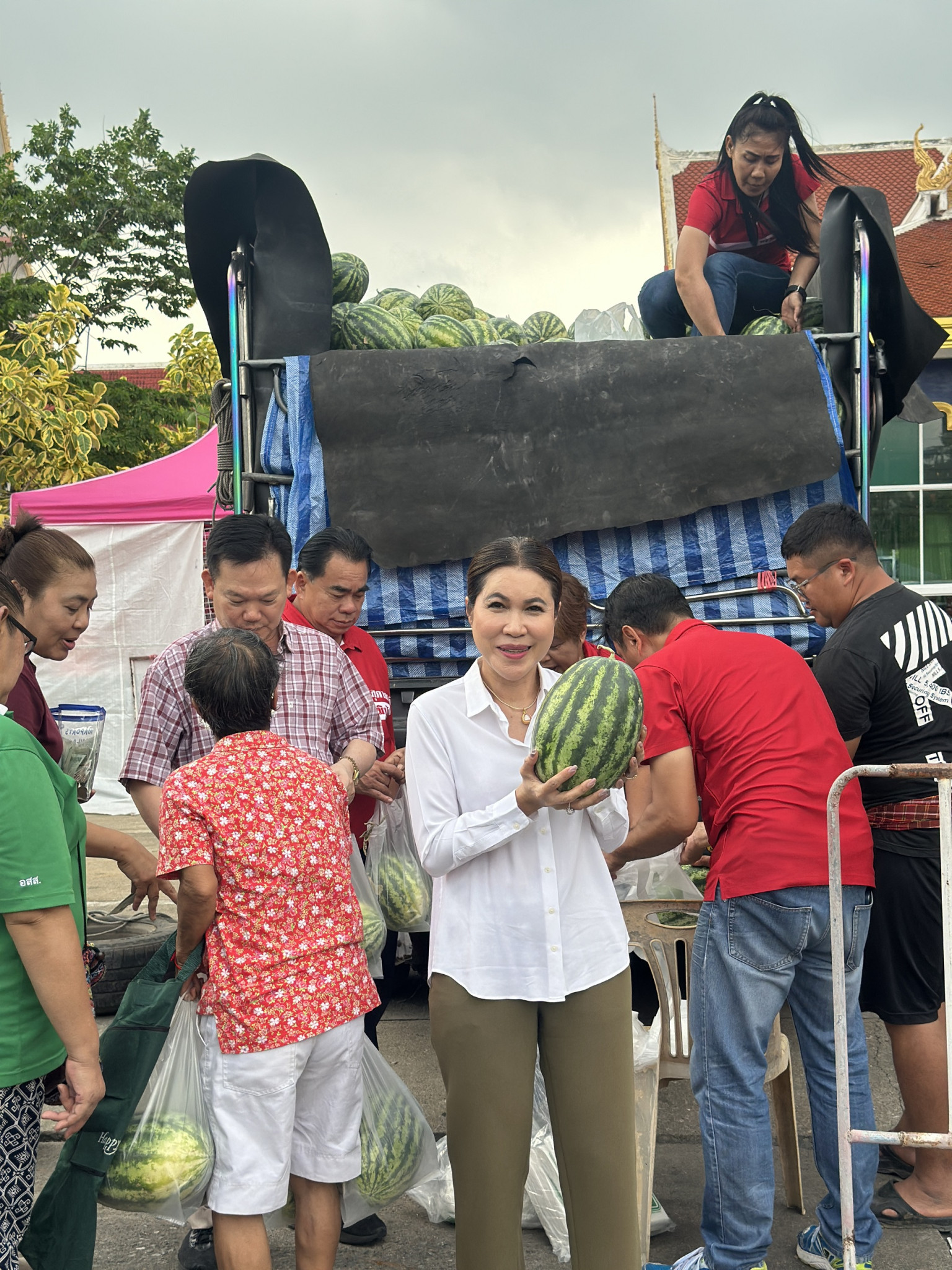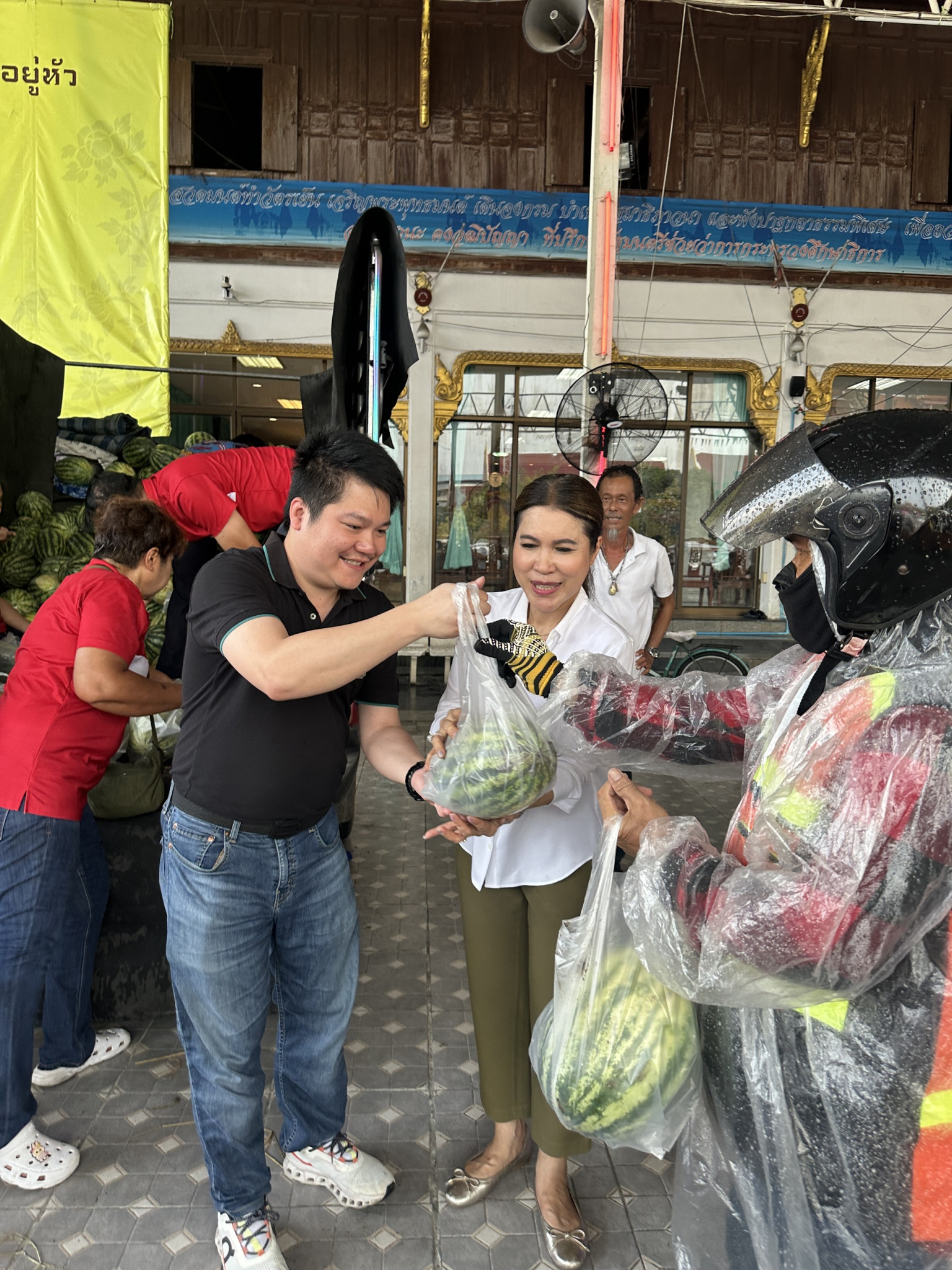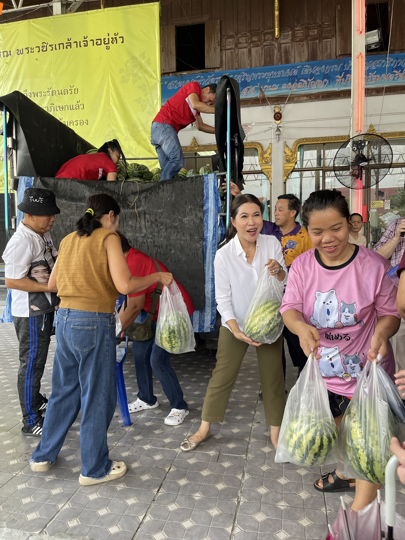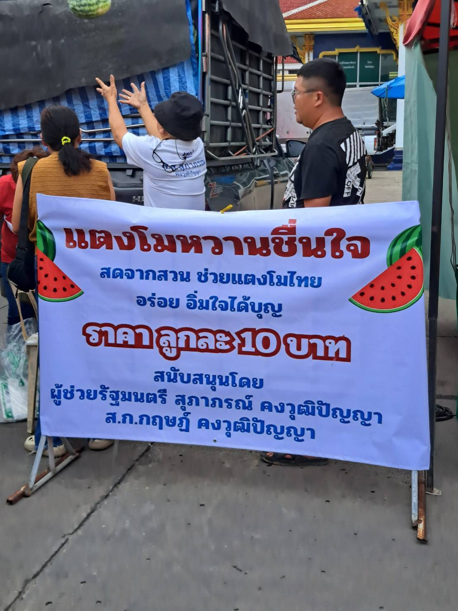 บรรยากาศภายในวัดเต็มไปด้วยความอบอุ่น ผู้คนแวะเวียนมาต่อแถวซื้อแตงโมลูกโต รสหวานฉ่ำ ในราคาย่อมเยา หลายคนรู้สึกดีใจที่ได้ช่วยเกษตรกรและได้สินค้าคุณภาพดีไปบริโภค