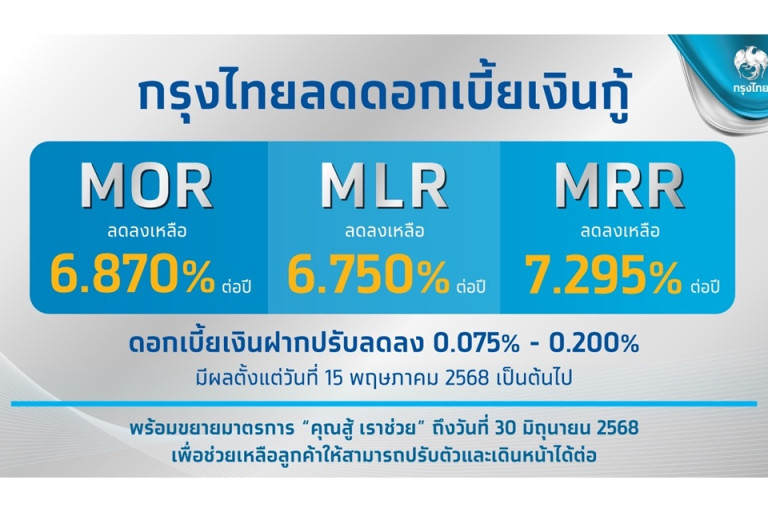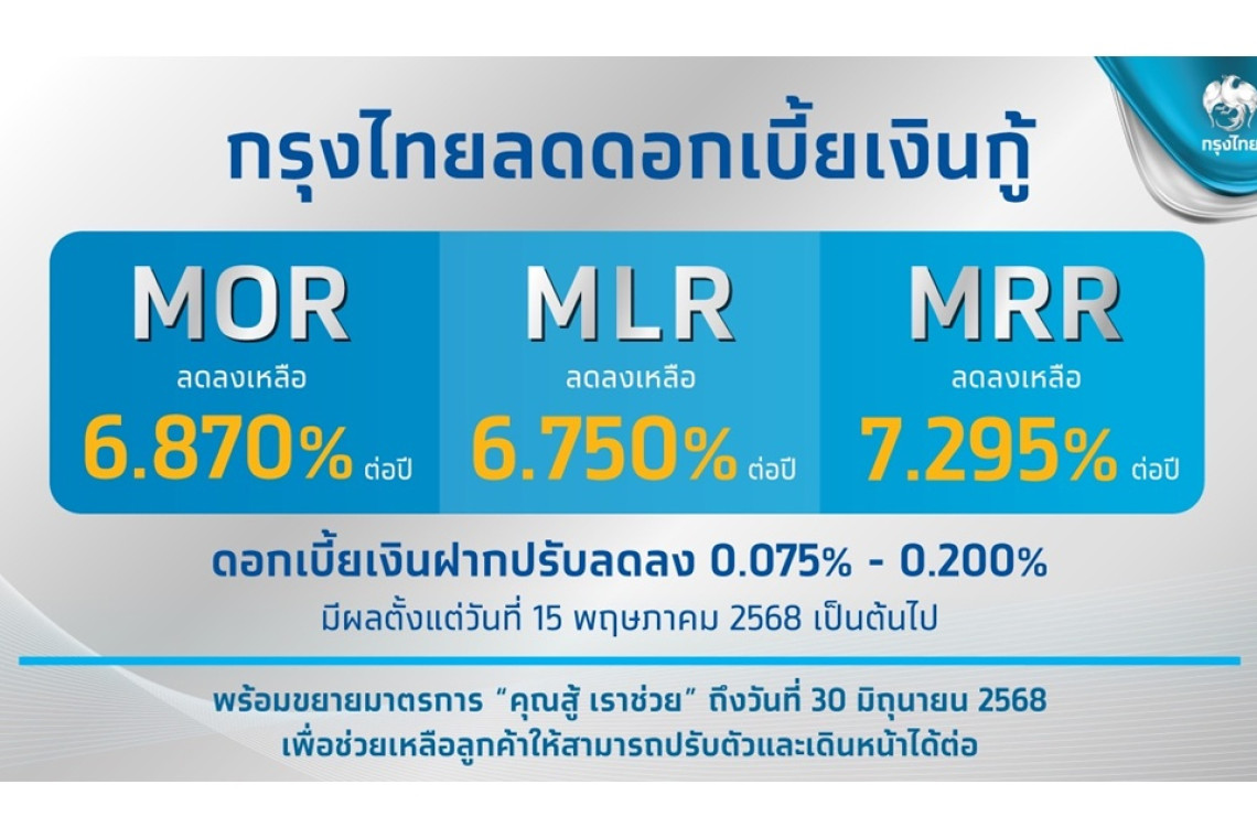 ธนาคารกรุงไทย ประกาศปรับลดอัตราดอกเบี้ยเงินกู้สูงสุด 0.15% ต่อปี เพื่อช่วยลูกค้าลดภาระทางการเงิน ในภาวะที่เศรษฐกิจมีแนวโน้มได้รับผลกระทบจากนโยบายการค้าสหรัฐฯ พร้อมสนับสนุนการปรับตัว สร้างโอกาสจากวิกฤต สู่การเติบโตอย่างยั่งยืน และปรับลดอัตราดอกเบี้ยเงินฝาก 0.075% - 0.20% ต่อปี มีผล 15 พฤษภาคม 2568