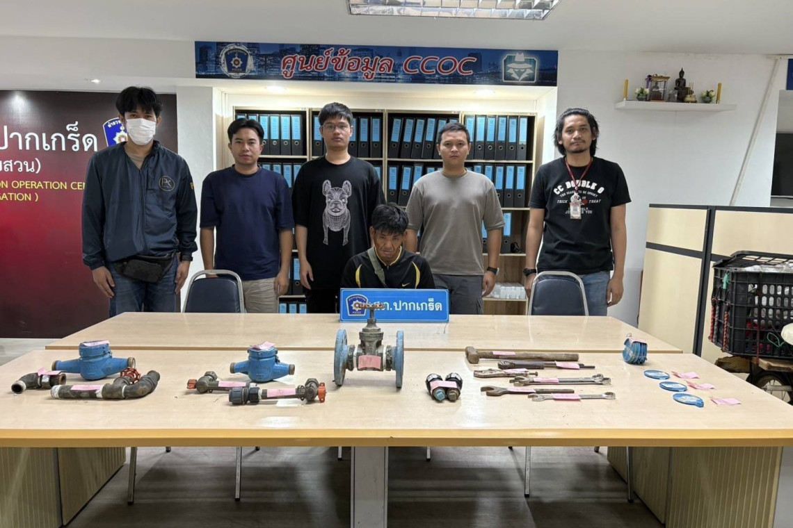 เมื่อวันที่ 15 พ.ค. 68 ที่ สภ.ปากเกร็ด จ.นนทบุรี พ.ต.ท.การุณย์ ลิมปิโรจนฤทธิ์ รอง ผกก.สส.สภ.ปากเกร็ด , พ.ต.ท.ยศธเดช สุขเทียบ สว.สส.สภ.ปากเกร็ด พร้อมด้วยกำลังเจ้าหน้าที่ตำรวจชุดสืบสวนได้ร่วมกันจับกุมผู้ต้องหา 2 ราย คือ นายสายสมร อายุ 42 ปี ที่อยู่หมู่ที่ 1 ต.หลักหก อ.เมืองปทุมธานี จ.ปทุมธานี จับกุมตัวได้บริเวณริมถนนศรีสมาน ช่วงปากซอยศรีสมาน 9 ม.3 ต.บ้านใหม่ อ.ปากเกร็ด จ.นนทบุรี พร้อมของกลาง จำนวน 19 รายการ คือ 1.มิเตอร์น้ำประปา ประทับตรา จำนวน 1 อัน 2.ข้อต่อทองเหลือง ขนาด 1 นิ้ว จำนวน 1 อัน 3.ข้อต่อทองเหลือง มีวาล์ว ขนาด 1 นิ้ว จำนวน 1 อัน 4.มิเตอร์น้ำประปา ประทับตรา จำนวน 1 อัน 5.ข้อต่อทองเหลือง ขนาด ¾ นิ้ว จำนวน 1 อัน 6.ข้อต่อทองเหลือง มีวาล์ว ขนาด 1 นิ้ว จำนวน 1 อัน 7.วาล์วน้ำประทับตรา กปน. ขนาด 2 นิ้ว จำนวน 1 อัน 8.ข้อต่อท่อน้ำ สีดำ จำนวน 2 อัน 9.ค้อน 1 อัน 10. ประแจล็อค แบบเลื่อนได้ จำนวน 1 อัน 11.คีมล็อค จำนวน 1 อัน 12.ประแจ เบอร์ 24 จำนวน 2 อัน 13.ประแจ เบอร์ 30 จำนวน 1 อัน 14.ประแจ เบอร์ 21 จำนวน 1 อัน 15.ฝาครอบมิเตอร์น้ำประปา จำนวน 10 อัน 16.ฝาครอบมิเตอร์น้ำประปา จำนวน 1 อัน 17.ฝาครอบมิเตอร์น้ำประปา จำนวน 1 อัน 18.ฝาครอบมิเตอร์น้ำประปา จำนวน 1 อัน 19.จักรยานแบบผู้หญิง สีดำ มีตะกร้าสีดำวางอยู่ตรงที่นั่งคนซ้อน จำนวน 1 คัน