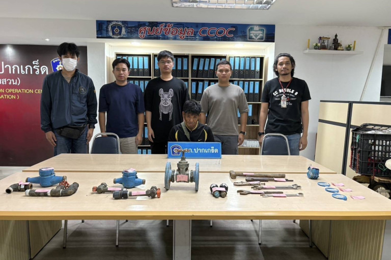 และ นายธีระวัฒน์ (สงวนนามสกล)อายุ 33 ปี ที่อยู่ หมู่ 7 ต.อี่หล่ำ อ.อุทุมพรพิสัย จ.ศรีสะเกษ จับกุมตัวได้ที่บริเวณบริษัท แห่งหนึ่ง หมู่ 1 ต.หลักหก อ.เมืองปทุมธานี จ.ปทุมธานี พร้อมด้วยของกลาง คือ 1.รถจักรยานแบบเสือภูเขา สีขาว มีตะกร้าสีขาววางอยู่ที่นั่งคนซ้อน จำนวน 1 คัน 2.เสื้อยืดคอกลมสีน้ำเงิน ด้านหลังมีตราการประปานครหลวง จำนวน 1 ตัว 3.เสื้อเชิ้ตคอปกสีฟ้า-ขาว มีสัญลักษณ์การประปานครหลวง จำนวน 1 ตัว 4.กระเป๋าเป้สะพายหลังสีดำ จำนวน 1 ใบ 5.กระเป๋าสะพายข้างสีน้ำตาล จำนวน 1 ใบ 6.ค้อนหัวเหล็ก จำนวน 1 อัน 7.ประแจ จำนวน 1 อัน 8.อุปกรณ์ส่วนต่อมิเตอร์น้ำ จำนวน 14 ชิ้น 9.เศษชิ้นส่วนมิเตอร์น้ำที่เหลือจากการชำแหละเอาทองเหลือง จำนวน 13 ชิ้น