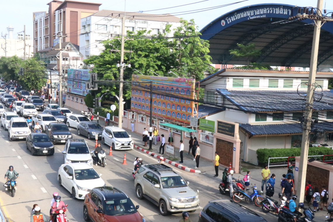 โคราช เปิดเทอมวันแรกรถติดยาว ผู้ปกครองแห่ส่งบุตรหลานโรงเรียนยอดนิยม ครูคัดกรองเข้มป้องติดเชื้อทางเดินหายใจ