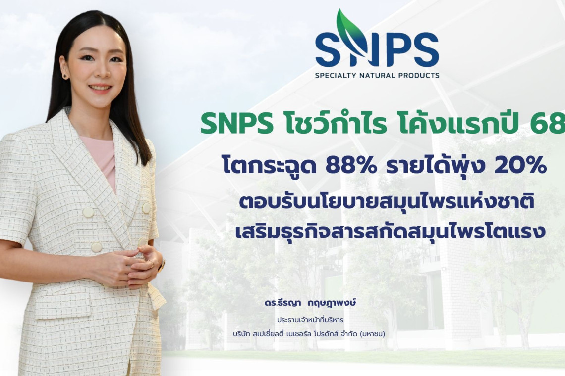 วันที่ 16 พฤษภารคม 2568 ดร.ธีรญา กฤษฎาพงษ์ ประธานเจ้าหน้าที่บริหาร บริษัท สเปเชี่ยลตี้ เนเชอรัล โปรดักส์ จำกัด (มหาชน) หรือ SNPS เปิดเผยว่า ผลประกอบการของบริษัทประจำไตรมาสที่ 1 ปี 2568 บริษัทมีรายได้รวม 120.83 ล้านบาท เพิ่มขึ้น 20 ล้านบาท หรือคิดเป็นเพิ่มขึ้น 19.84% จากช่วงเดียวกันปี 2567 ที่มีรายได้รวม 100.83 ล้านบาท และมีกำไรสุทธิ 19.56 ล้านบาท เพิ่มขึ้น 9.17 ล้านบาท คิดเป็นอัตราการเติบโต 88.26% จากช่วงเดียวกันปี 2567 ที่มีกำไรสุทธิอยู่ที่ 10.39 ล้านบาท