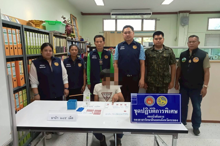 เมื่อเวลา 10.30 น. วันที่ 16 พ.ค.68 นายไตรภพ วงศ์ไตรรัตน์ ผวจ.ระยอง พร้อมด้วยนายกำธร เวหน รองผู้ว่าฯ นายเรืองฤทธิ์ ประกอบธรรม ปลัดจังหวัดระยอง นายทัศนเดชา บุญสนธิ์ ป้องกันจังหวัดระยอง นายไกรยุทธ วิลาวัลย์ เจ้าพนักงานปกครองชำนาญการ นายจุมพล กาญจนเทียนศรี เจ้าพนักงานปกครองชำนาญการ นายปิยวัฒน์ วัชรเมฆินทร์ เจ้าพนักงานปกครองปฏิบัติการ และเจ้าหน้าที่ชุดปฏิบัติการพิเศษกองร้อยอส.จังหวัดระยอง ร่วมกันจับกุมนายเสถียร หรือ เบนซ์ อายุ 27 ปี ชาวจังหวัดราชบุรี นายอู อายุ 25 ปี เพศชาย สัญชาติเมียนมา นายประสิทธิ์ หรือ สิทธิ์ อายุ 59 ปี ชาวจังหวัดพะเยา พร้อมด้วยของกลาง ยาบ้า 298 เม็ด ยาไอซ์ 0.33 กรัม ผลตรวจปัสสาวะสีม่วง 3 ใบ
