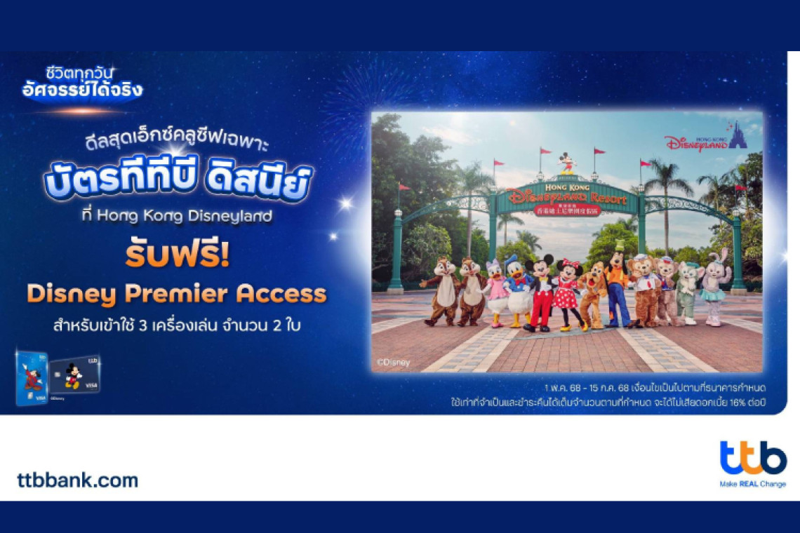 เพื่อชีวิตทุกวันอัศจรรย์ได้จริง ทีเอ็มบีธนชาต หรือ ทีทีบี เดินหน้ามอบสิทธิประโยชน์ที่เหนือกว่ากับประสบการณ์สุดพิเศษให้กับลูกค้าบัตรเดบิต ทีทีบี ออลล์ฟรี ดิสนีย์ และบัตรเครดิต ทีทีบี ดิสนีย์ รับฟรี บัตร Disney Premier Access - สำหรับสิทธิ์เข้าใช้เครื่องเล่นยอดฮิต 3 เครื่องเล่น จำนวน 2 ใบ เมื่อซื้อแพ็กเกจ “Stay and Play for Two with Early Park Entry” ที่รวมความสนุกและห้องพักโรงแรมในเครือฮ่องกงดิสนีย์แลนด์รีสอร์ทผ่านทางเว็บไซต์ทางการของฮ่องกงดิสนีย์แลนด์และชำระผ่านบัตรเดบิต ทีทีบี ออลล์ฟรี ดิสนีย์ หรือบัตรเครดิต ทีทีบี ดิสนีย์ ระหว่างวันที่ 1 พฤษภาคม 2568 – 15 กรกฎาคม 2568