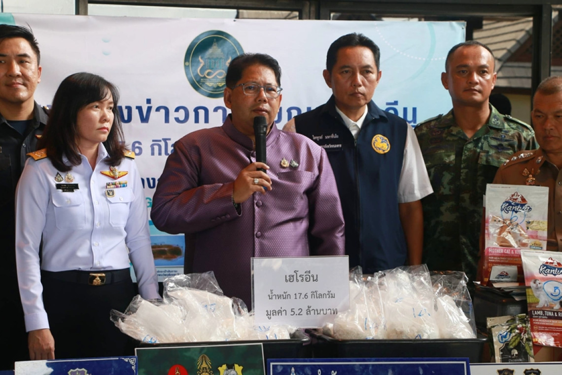 เมื่อวันที่ 17 พ.ค.68 ที่ด่านพรมแดนสะพานมิตรภาพไทย-ลาว แห่งที่ 1 จังหวัดหนองคาย ฝั่งขาเข้าประเทศ อ.เมืองหนองคาย จ.หนองคาย นายสมภพ สมิตะสิริ ผู้ว่าราชการจังหวัดหนองคาย,นายไพฑูรย์ มหาชื่นใจ รองผู้ว่าราชการจังหวัดหนองคาย,นางสาววรรณา ผู้อุตส่าห์ ผู้อำนวยการสำนักงานศุลกากรหนองคาย ,พันเอกเรวัฒ ธรรมจิรเดช รองผู้บังคับการกองบังคับการควบคุมที่ 2 (ร.13) กองกำลังสุรศักดิ์มนตรี,นายภาคิน เทียบคำ ผู้อำนวยการส่วนควบคุมทางศุลกากร,นายพัฒนพงศ์ ตันติวัฒนกุล หัวหน้าฝ่ายบริการศุลกากร,พ.ต.อ.จิรวิทย์ ปานยิ้ม ผกก.สภ.เมืองหนองคาย,พ.ต.อ.นพดล รักชาติ ผกก.ตม.หนองคาย พร้อมเจ้าหน้าที่ความมันคงและฝ่ายปกครอง ร่วมกันแถลงผลการจับกุม นายคุณากร พร้อม เฮโรอีน กว่า 17.6 กก.ซุกซ้อนมาในถุงกาแฟ 5 ถุง และถุงอาหารสัตว์ จำนวน 13 ถุง มากับรถโดยสารข้ามด่านสะพานฯ