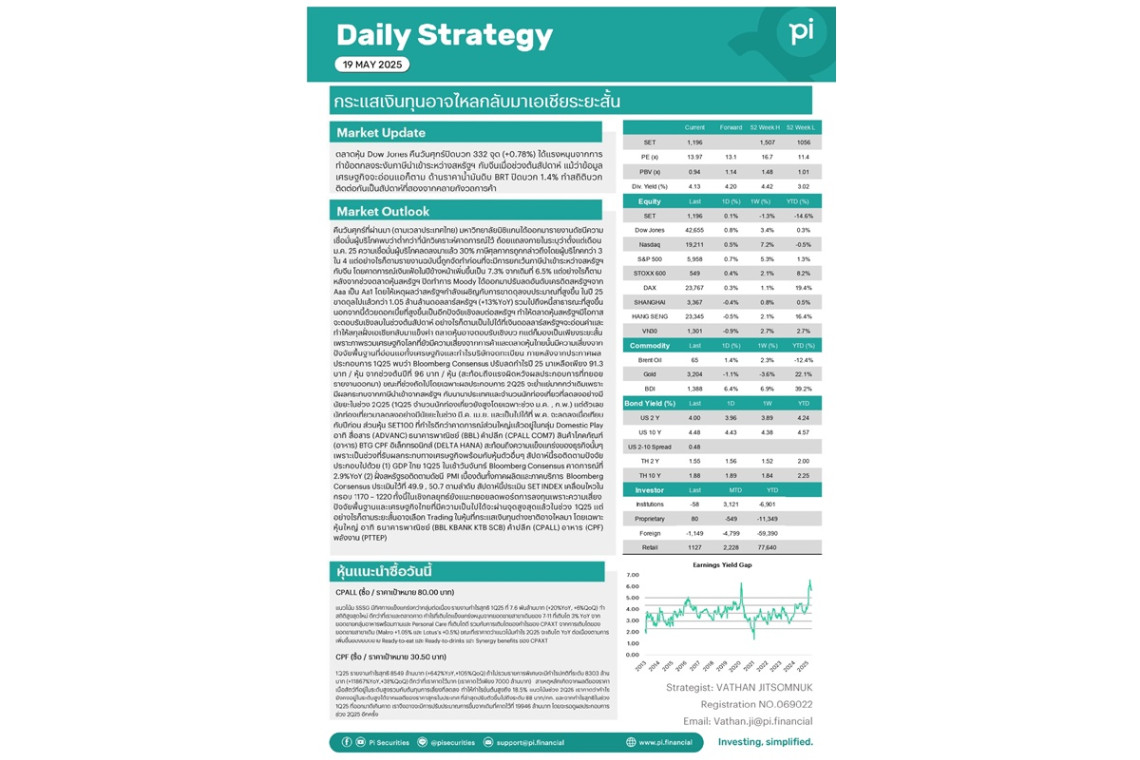 วันที่ 19 พฤษภาคม 2568 บล.พายเผยว่า ตลาดหุ้น Dow Jones คืนวันศุกร์ปิดบวก 332 จุด (+0.78%) ได้แรงหนุนจากการทำข้อตกลงระงับภาษีนำเข้าระหว่างสหรัฐฯกับจีนเมื่อช่วงต้นสัปดาห์ แม้ว่าข้อมูลเศรษฐกิจจะอ่อนแอก็ตาม ด้านราคาน้ำมันดิบ BRT ปิดบวก 1.4% ทำสถิติบวกติดต่อกันเป็นสัปดาห์ที่สองจากคลายกังวลการค้า