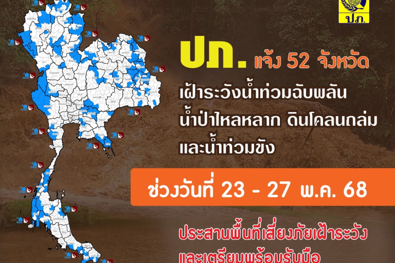 ปภ. แจ้ง 52 จังหวัด เฝ้าระวังน้ำท่วมฉับพลัน น้ำป่าไหลหลาก ดินโคลนถล่ม และน้ำท่วมขัง ช่วงวันที่ 23 – 27 พ.ค. 68 เร่งประสานพื้นที่เสี่ยงภัยเฝ้าระวังและเตรียมพร้อมรับมือ