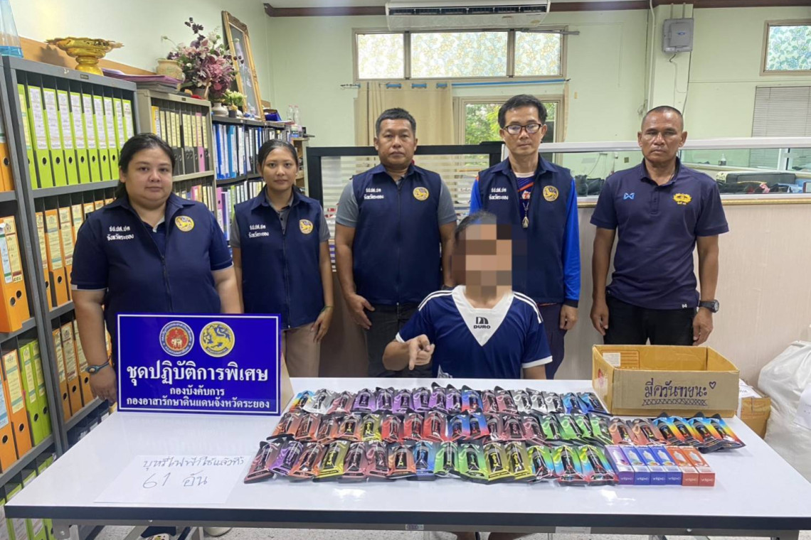 วันที่ 24 พ.ค.68 เวลา 08.30 น.นายไตรภพ วงศ์ไตรรัตน์ ผวจ.ระยอง พร้อมด้วยนายกำธร เวหน รองผู้ว่าฯ นายเรืองฤทธิ์ ประกอบธรรม ปลัดจังหวัดระยอง นายทัศนเดชา บุญสนธิ์ ป้องกันจังหวัดระยอง นายไกรยุทธ วิลาวัลย์ เจ้าพนักงานปกครองชำนาญการ นายจุมพล กาญจนเทียนศรี เจ้าพนักงานปกครองชำนาญการ นายปิยวัฒน์ วัชรเมฆินทร์ เจ้าพนักงานปกครองปฏิบัติการ และเจ้าหน้าที่ชุดปฏิบัติการพิเศษกองร้อยอส.จังหวัดระยอง ร่วมกันจับกุม นายสุรวิชัย หรือเปรม อายุ 33 ปี ชาวระยอง พร้อมด้วยของกลางบุหรี่ไฟฟ้าใช้แล้วทิ้ง 9,000 คำ จำนวน 55 ชิ้น บุหรี่ไฟฟ้าแบบใช้แล้วทิ้ง 5,000 คำ จำนวน 6 ชิ้น รวมทั้งหมด 61 ชิ้น
