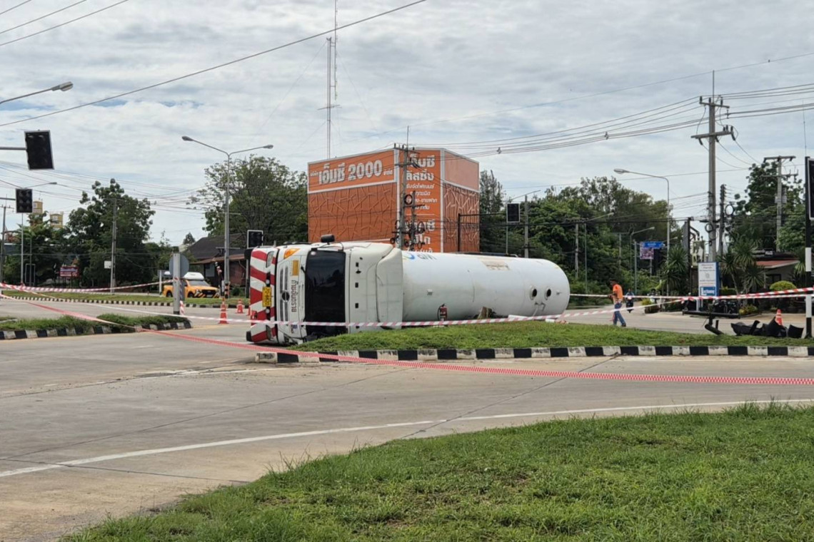 วันที่ 24 พ.ค.68 เวลา 09.10 น. ร.ต.ท.ขวัญใจ ทองดี หัวหน้าสายตรวจสภ.จอมบึง จ.ราชบุรี ได้รับแจ้งเหตุรถบยรทุกแก๊สหุงต้มพลิกคว่ำบริเวณสี่แยกไฟแดงปากบึง ม.2 ต.จอมบึง อ.จอมบึง จึงเดินทางไปตรวจสอบพบรถบรรทุก 18 ล้อขนาดใหญ่ ยี่ห้อ ฮีโน่ สีขาว หมายเลขทะเบียน ส่วนหัว70-8820 ราชบุรี ส่วนหางทะเบียน 70-8820 กาญจนบุรี ด้านมีถังแคปซูลภายในบรรจุแก๊สหุงต้มจำนวน 17 ตัน พลิกคว่ำทับเสาสัณญานไฟจราจรเสียหายไป 1 ต้น เจ้าหน้าที่ต้องนำเชือกเข้าไปกั้นพื้นที่ห้ามผู้ไม่เกี่ยวข้องเข้าไป