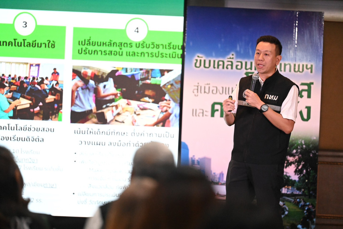 2.พัฒนาครู โดยเฉพาะเรื่องเทคโนโลยี เนื่องจากครูหลายคนมีอายุมาก แต่เรื่องอายุไม่ใช่ปัญหา ขอให้มีความพร้อมในการพัฒนาตนเอง ในปี 2568 กทม.ตั้งเป้าพัฒนาครูแกนนำด้านเทคโนโลยีจำนวน 1,400 คน ให้สามารถออกแบบหลักสูตร สื่อการสอน และวัดผลด้วยเทคโนโลยีได้ เป้าหมายคือทุกโรงเรียนในสังกัดกทม. ต้องมีครูแกนนำในด้านนี้ โดยกทม. จะสร้างโค้ช 120 คน เพื่อพัฒนาครูแกนนำดังกล่าว รวมถึงจัดทำโครงการก่อการครู เพื่อเน้นให้ครูเข้าใจความเป็นครูมากขึ้น 3.นำเทคโนโลยีมาใช้ เนื่องจากปัจจุบันเด็กเรียนรู้จากเทคโนโลยีนอกห้องเรียนมากกว่าในโรงเรียน ดังนั้น โรงเรียนต้องปรับตัว กทม.จึงมีนโยบายห้องเรียนดิจิทัล โดยเริ่มนำร่องในปี 2566 ที่โรงเรียนไทยนิยมสงเคราะห์ เขตบางเขน จำนวน 1 ห้องเรียน ปรากฏว่าผลการเรียนดีขึ้นทุกวิชา ในปี 2567 จึงขยายเพิ่มเป็น 10 โรงเรียน ส่วนในปี 2568 ได้รับงบประมาณในการจัดทำห้องเรียนดิจิทัล ในระดับชั้น ป.4 และ ม.1 ในโรงเรียน 437 แห่งทั่วกรุงเทพฯ นอกจากนี้ ยังใช้ ai มาช่วยสอนในวิชาที่ยากที่สุด เช่น วิชาภาษาอังกฤษ โดยช่วยฝึกพูดฝึกเขียน เนื่องจากการใช้ ai สามารถฝึกเด็กได้พร้อมกันและทั่วถึงกันทุกคน ทั้งเด็กเก่งและไม่เก่ง จากการทดลอง 6 โรงเรียน ในห้องเรียนที่มีการเรียนดีที่สุด พบว่า ภาษาอังกฤษดีขึ้นร้อยละ 37 ซึ่งในปี 2568 จะขยายแนวทางดังกล่าวให้ครบทุกโรงเรียน นอกจากนี้ยังใช้ ai มาช่วยเสริมศักยภาพและพัฒนาการสอนของครู ปัจจุบันนำร่องไปแล้ว 2 โรงเรียน