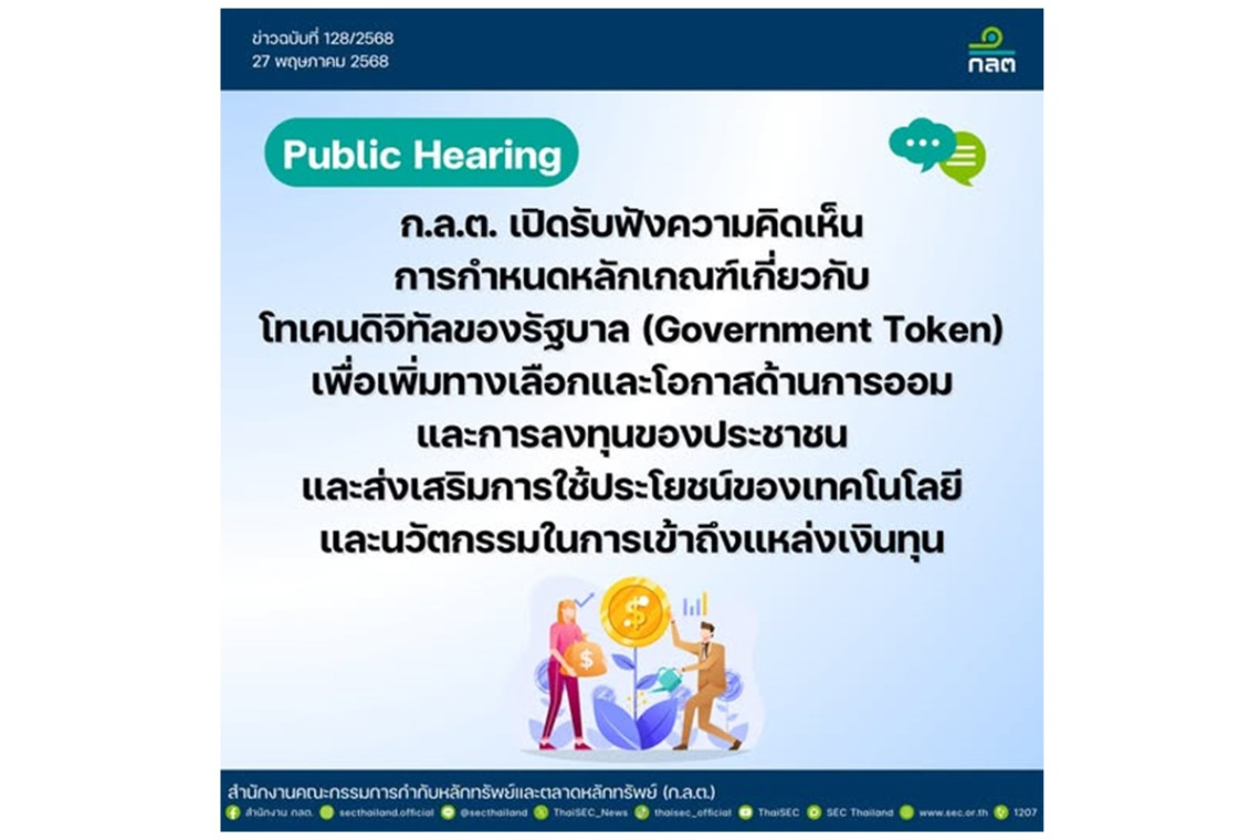 วันที่ 27 พฤษภาคม 2568 สำนักงานคณะกรรมการกำกับหลักทรัพย์และตลาดหลักทรัพย์ (ก.ล.ต.) เปิดรับฟังความคิดเห็นต่อหลักการและร่างประกาศเกี่ยวกับการกำหนดหลักเกณฑ์เกี่ยวกับโทเคนดิจิทัลของรัฐบาล (Government Token : G-Token) เพื่อสนับสนุนและส่งเสริมการเพิ่มทางเลือกและโอกาสด้านการออมและการลงทุนของประชาชนอย่างทั่วถึง (financial inclusion) รวมถึงการนำประโยชน์จากเทคโนโลยีและนวัตกรรมมาใช้เพิ่มประสิทธิภาพในการระดมทุนและลงทุนในตลาดทุนไทย (promoting digital financial innovation) โดยมีการกำกับดูแลที่เหมาะสม เกิดความเท่าเทียมกันในการแข่งขัน (level playing field) และมีกลไกในการดูแลผู้ลงทุนอย่างเพียงพอ (investor protection)