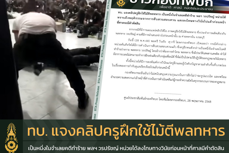 เมื่อวันที่ 28 พ.ค.68 พลตรี วินธัย สุวารี โฆษกกองทัพบก เปิดเผยว่า กรณีดังกล่าว หน่วยต้นสังกัดได้มีการดำเนินการสืบสวนสอบสวนแล้ว ซึ่งครูฝึกคนดังกล่าวเป็นหนึ่งในจำเลยในคดีทำร้ายร่างกาย พลทหาร วรปรัชญ์ โดยอ้างว่าต้องการทำโทษ พลทหาร ซึ่งมีประวัติเสพสารเสพติด ทำให้มีอาการเบลอไม่สามารถทำการฝึกเช่นเดียวกับกลุ่มเพื่อนได้ ซึ่งไม่เป็นไปตามวิธีปฏิบัติของกฎหมายวินัยทหาร