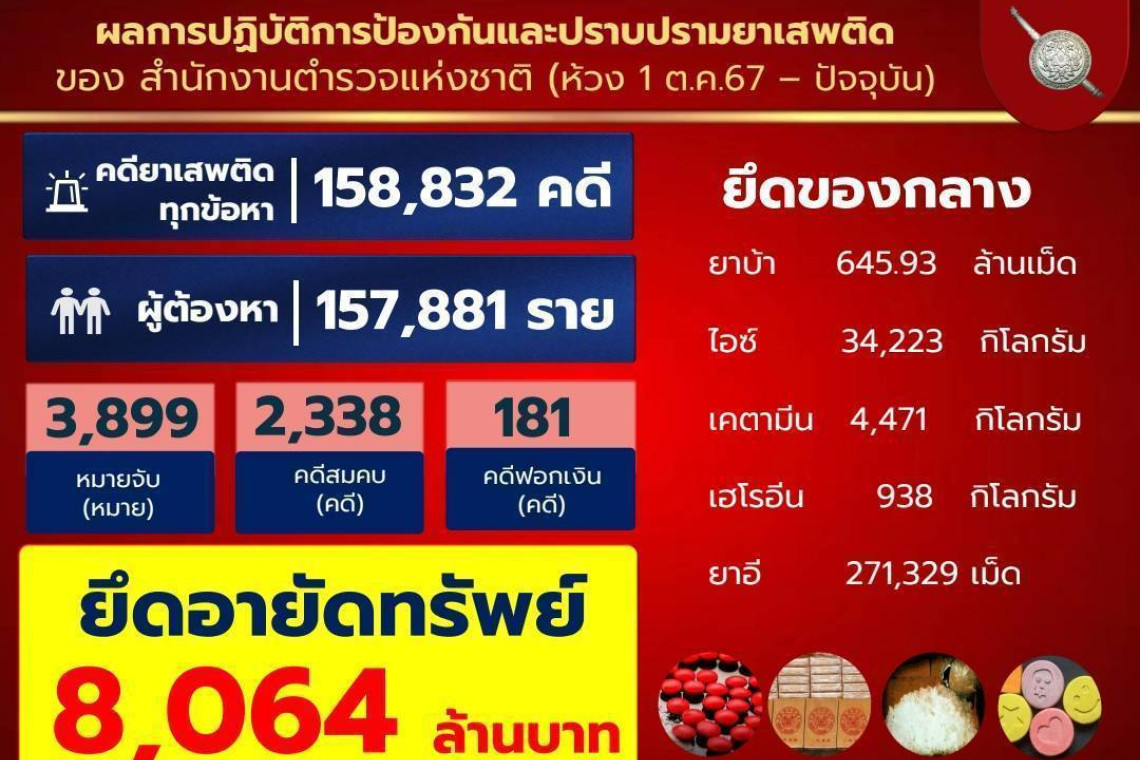 -จับกุมผู้กระทำผิดเกี่ยวกับยาเสพติดทุกข้อหาทั่วประเทศ 158,832 คดี  ผู้ต้องหา 157,881 คน จับกุมตามหมายจับ 3,899 คน ดำเนินคดีข้อหาสมคบ สนับสนุน 2,338 คดีข้อหาฟอกเงิน 181 คดี ของกลางยาเสพติด ยาบ้า 645.93 ล้านเม็ด, ไอซ์ 34,223 กก., เฮโรอีน 938 กก., คีตามีน 4,471 กก. และยาอี 271,329 เม็ด ยึดอายัดทรัพย์ผู้ค้ายาเสพติด 8,064 ล้านบาท  พร้อมทั้งได้สั่งการให้ขยายผลถึงระดับเครือข่ายและผู้สั่งการ ถือเป็นสัญญาณเตือนแรง! ถึงกลุ่มค้ายาที่ยังเหลืออยู่ว่า “ไม่มีที่ยืนในแผ่นดินไทย!”