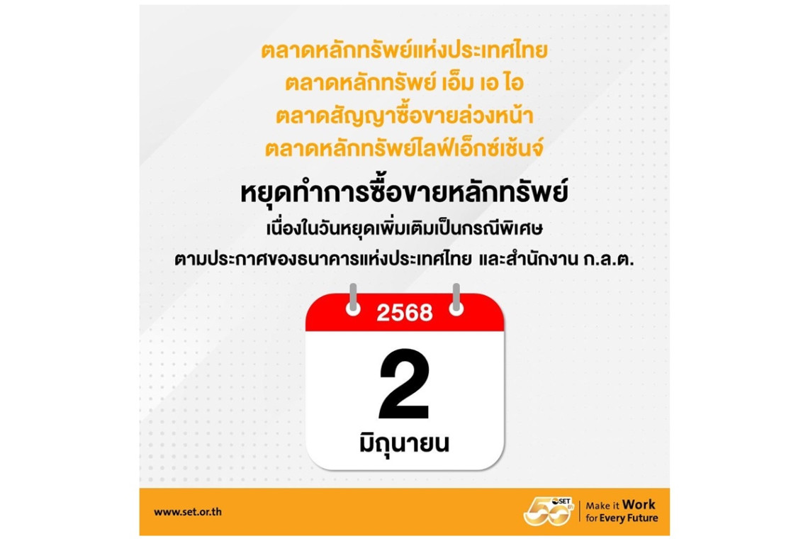 ตลาดหลักทรัพย์แห่งประเทศไทย ตลาดหลักทรัพย์ เอ็ม เอ ไอ ตลาดสัญญาซื้อขายล่วงหน้า ตลาดหลักทรัพย์ไลฟ์เอ็กซ์เช้นจ์ หยุดทำการซื้อขายหลักทรัพย์ ในวันจันทร์ที่ 2 มิถุนายน 2568 เนื่องในวันหยุดเพิ่มเติมเป็นกรณีพิเศษ ตามประกาศของธนาคารแห่งประเทศไทย และสำนักงาน ก.ล.ต.