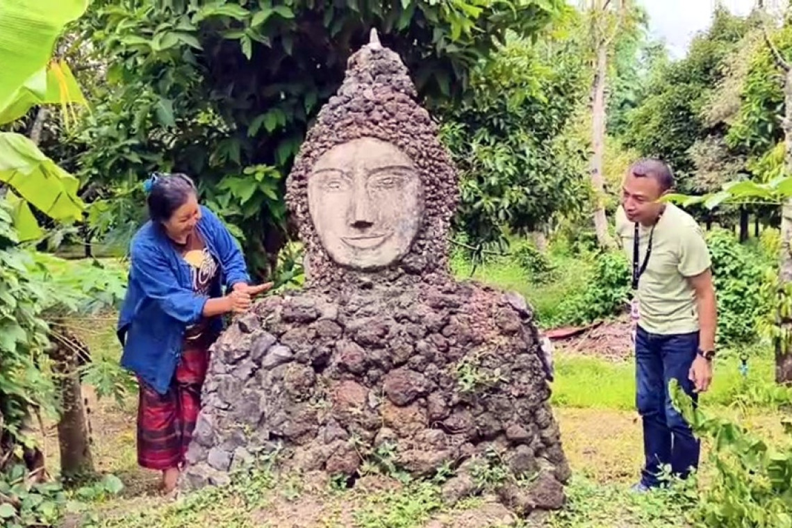 ระหว่างผู้สื่อข่าวได้เดินเที่ยวชมสวน ได้สังเกตเห็นพระพุทธรูป ที่มีลักษณะแปลกตา ตั้งอยู่ภายในสวนทุเรียน จำนวน 3 องค์ จึงเดินเข้าไปดูใกล้ๆ ถึงกับอึ้ง พบว่าองค์พระพุทธรูปถูกปั้นขึ้นโดยใช้เศษหิน เศษปูน ประติดประต่อกัน เป็นลวดลายที่สวยงามมาก ซึ่งองค์แรก มีขนาดกว้างประมาณ 1.50 เมตร สูง 1.50 เมตร องค์ที่ 2 กว้าง 2 เมตร สูง 2 เมตร และองค์ที่ 3 อยู่ใต้ต้นโพธิ์ที่เกิดขึ้นเองโดยธรรมชาติ มีขนาดกว้าง 3 เมตร สูง 3 เมตร โดยเฉพาะบริเวณเศียรองค์พระพุทธรูป มีการใช้เศษหินแดงที่อยู่ตามริมถนนบนทางลูกรัง ตั้งเรียงกันขึ้นอย่างงดงาม