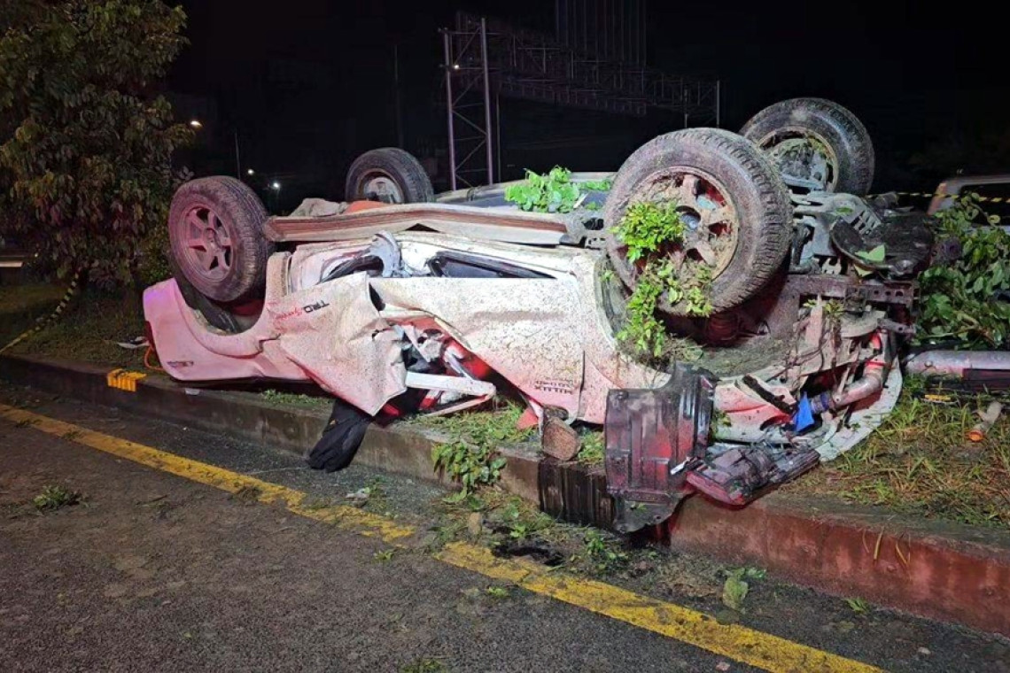 ที่เกิดเหตุบริเวณเกาะกลางถนน พบรถกระบะ 4 ประตู ยี่ห้อโตโยต้า รุ่นวีโก้ สีขาว ทะเบียน กทม. เสียหลักพลิกคว่ำหงายท้อง ชนเสาไฟฟ้าบริเวณเกาะกลางถนน ผู้เสียชีวิตเป็นชาย 1 ราย ทราบชื่อคือนายภากรณ์ (ขอสงวนนามสกุล) อายุ 37 ปี อาชีพผู้ช่วย ผจก.ฝ่ายปฏิบัติการ บริษัทฯ รปภ.แห่งหนึ่ง เสียชีวิตติดอยู่ภายในซากรถ สวมเสื้อโปโลสีเขียว ใส่เสื้อกั๊กสีดำด้านนอก สวมกางเกงขายาวสีกรมท่า สภาพศพพบบาดแผลบริเวณใบหน้า มีเลือดออก เจ้าหน้าที่กู้ภัยจึงนำอุปกรณ์ตัดถ่างมาดำเนินการช่วยเหลือ ใช้เวลากว่า 30 นาที สามารถนำร่างผู้เสียชีวิตที่ติดคาอยู่ภายในรถออกมาได้