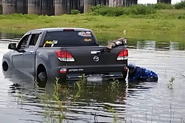 เมื่อเวลา 09.00.น. วันที่ 1 มิ.ย.68 สถานีตำรวจภูธรลานสักได้รับแจ้งเหตุว่ามีรถกระบะตกลงน้ำ ที่หน้าเขื่อนสปริงเวย์ หมู่ 6 ต.ระบำ อ.ลานสัก จ.อุทัยธานี ได้พบกับนายศักดิ์นรินทร์ เสลารัตน์ผู้ใหญ่บ้านหมู่ 6 บ้านห้วยเปล้า อยู่ในที่เกิดเหตุ พร้อมเจ้าของรถกระบะคันจมน้ำ ยี่ห้อโตโยต้าสีดำ ชื่อนายขวัญ อายุ 35 ปี อยู่บ้านปางไม้ไผ่ ต.ระบำ อ.ลานสัก จ.อุทัยธานี ได้เปิดเผยว่า ช่วงเช้าตนเองออกจากบ้านมาเพียงลำพัง พร้อมกับเบ็ดคู่ใจ มาตกปลาที่หน้าเขื่อน เนื่องจากก่อนหน้านี้ตนเองเคยมาตกปลาที่นี่ 2 ครั้ง โดยนำรถกระบะมาด้วย แต่ขณะนี้ตนเองไม่ทราบว่าน้ำจะขึ้นสูง ตนเองจึงได้ขับรถลุยน้ำข้ามฝั่งไป พร้อมกับอุปกรณ์ตกปลา ติดท้ายรถไปด้วย จังหวะไปถึงกลางน้ำ ดินเกิดยุบตัว และสังเกตเห็นว่าน้ำก็เริ่มสูงจะท่วมรถแล้ว ตนเองจึงรีบหนีเอาตัวรอด กระโดดออกกระจกข้าง และรีบลุยน้ำเข้าฝั่ง หวั่นว่าประตูจะล็อคอัตโนมัติเนื่องจากโดนน้ำ พร้อมกับแจ้งเจ้าหน้าที่ให้มายังที่เกิดเหตุ เพื่อขอความช่วยเหลือ ยกรถขึ้นมาจากในน้ำ
