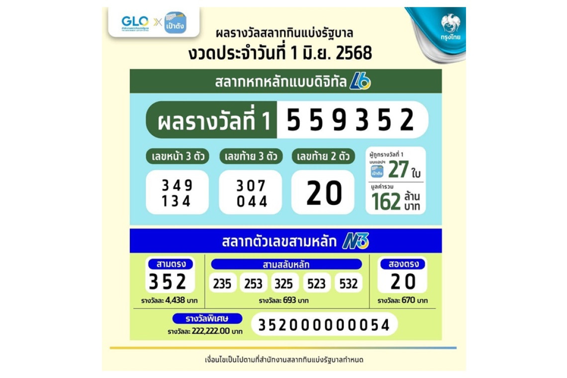 วันที่ 1 มิถุนายน 2568 สลากดิจิทัล บนแอปฯเป๋าตัง ของธนาคารกรุงไทย งวดวันที่ 1 มิ.ย. 68 เลขสลากรางวัลที่ 1: 559352 มีคนถูกรางวัลที่ 1 รวม 27 ใบ 162 ล้านบาท