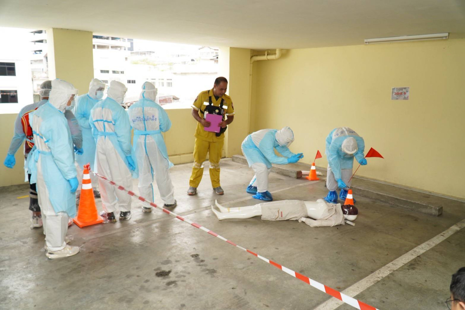 ในช่วงฝึกภาคสนาม มีการจำลองสถานการณ์อาคารถล่ม