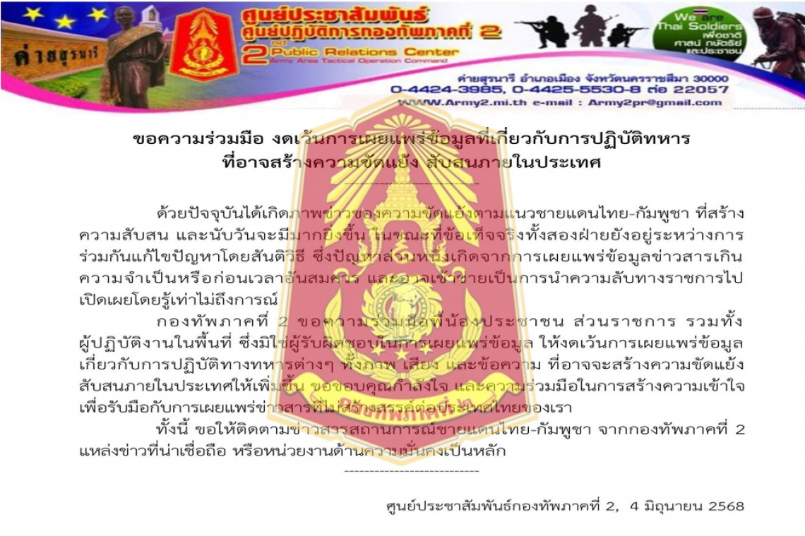 วันที่ 5 มิ.ย.68 กองทัพภาคที่ 2 ขอความร่วมมือ งดเว้นการเผยแพร่ข้อมูลที่เกี่ยวกับการปฏิบัติทางทหาร ที่อาจสร้างความขัดแย้ง สับสนภายในประเทศ