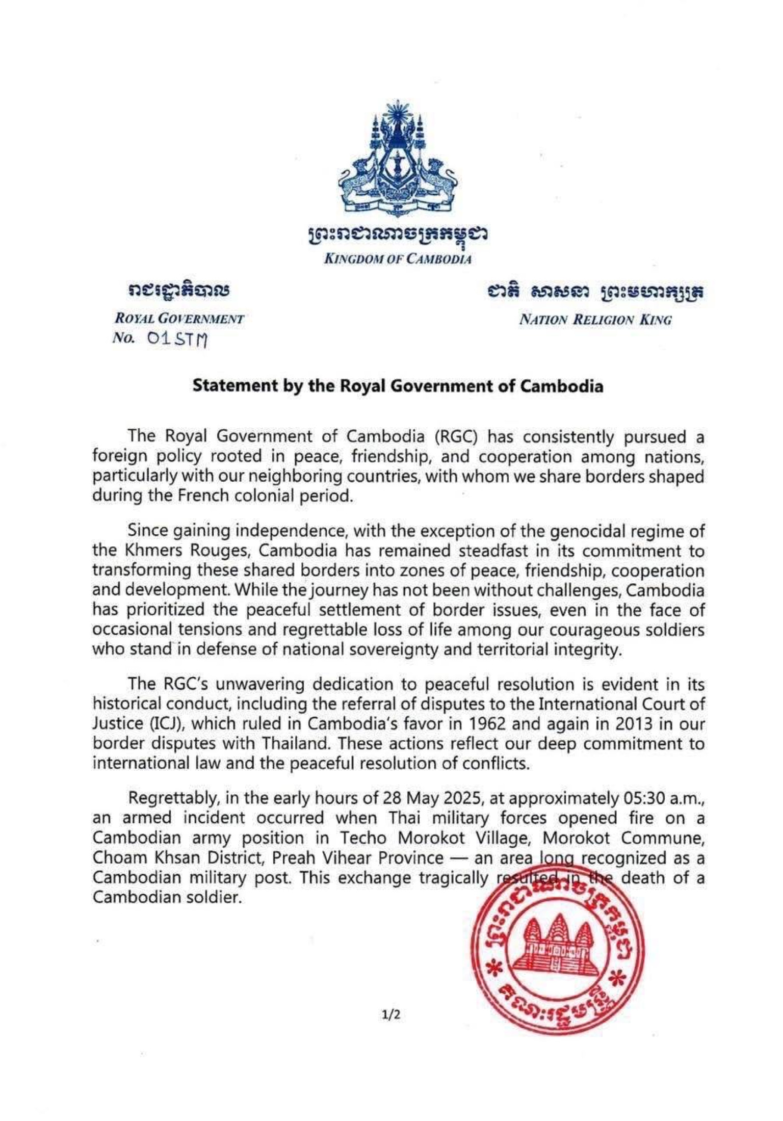 สวนทางกับการนั่งพับเพียบกระมิดกระเมี้ยนพูดอ้อม ๆ ให้ต้องตีความและไม่ยอมพูดเรื่องที่ประเทศไทยไม่ยอมรับอำนาจศาลโลก ICJ ให้หนักแน่นชัดเจนในแถลงการณ์ของรัฐบาลเมื่อเช้าวานนี้ 4 มิถุนายน 2568 รัฐบาลกัมพูชาก็ออกแถลงการณ์กล่าวหาอีกครั้งว่าทหารไทยโจมตีทหารกัมพูชาในพื้นที่ของกัมพูชา และจะขอใช้กลไกของศาลโลก ICJ แก้ปัญหา ขอให้รัฐบาลไทยร่วมมือด้วย ตามภาพที่ปรากฏ