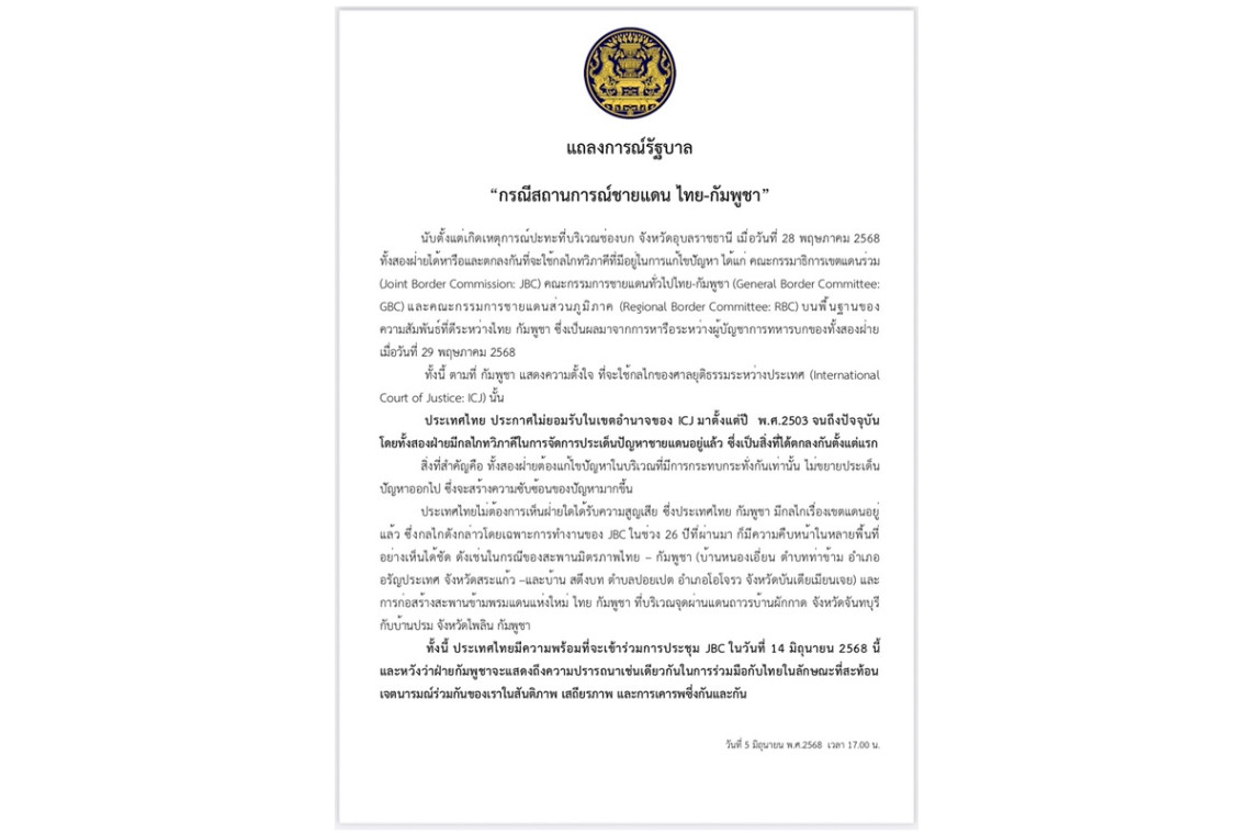 วันที่ 5 มิถุนายน 2568 นายจิรายุ ห่วงทรัพย์ โฆษกประจำสำนักนายกรัฐมนตรี เปิดเผยว่า ภายหลังเกิดแหตุการณ์ที่บริเวณชายแดนไทย -กัมพูชา เมื่อวันที่ 28 พฤษภาคม 2568 ที่ผ่านมานั้น เวลา 16.30 น. รัฐบาลได้ออกแถลงการณ์กรณีดังกล่าว เป็นฉบับที่ 2 ดังนี้