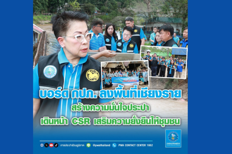 คณะกรรมการ อนุกรรมการ และผู้บริหารการประปาส่วนภูมิภาค (กปภ.) ลงพื้นที่จังหวัดเชียงราย ติดตามสถานการณ์ในพื้นที่ที่ได้รับผลกระทบจากอุทกภัยและการปนเปื้อนของสารพิษในแม่น้ำกกซึ่งเป็นแหล่งน้ำดิบสำคัญสำหรับการผลิตน้ำประปา พร้อมพบปะชุมชนและดำเนินกิจกรรม CSR