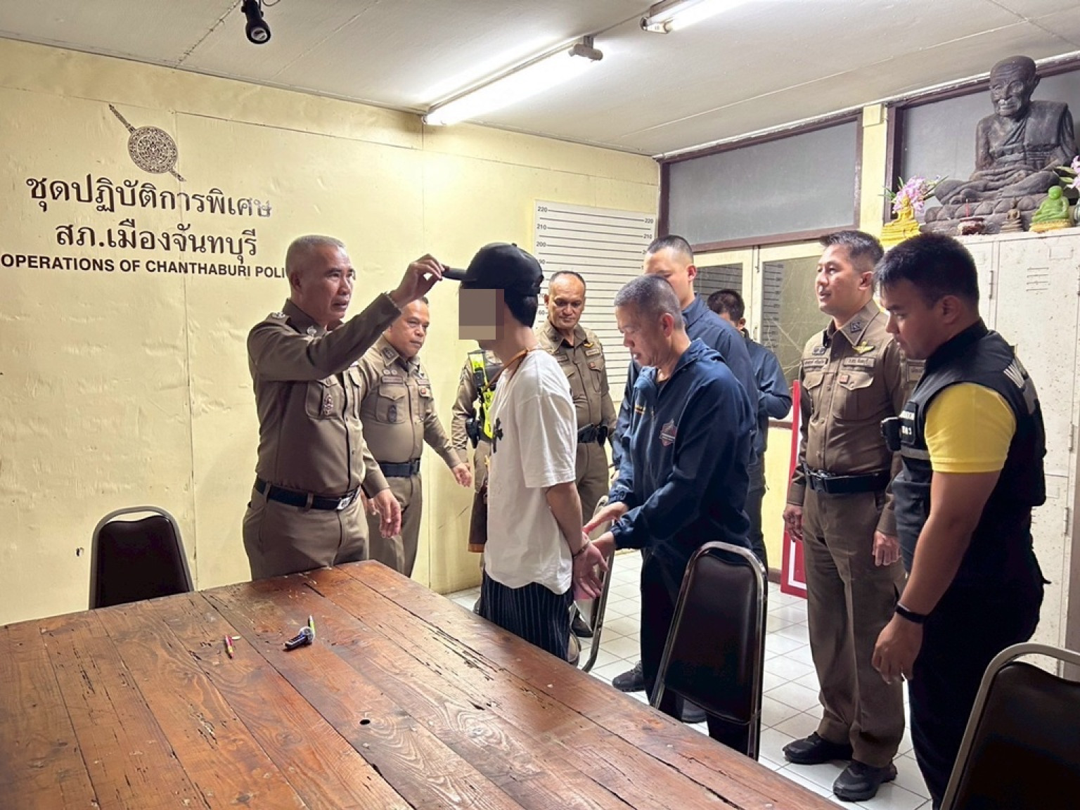 เมื่อค่ำวันที่ 5 มิ.ย.68 ที่งานป้องกันและปราบปราม สภ.เมืองจันทบุรี พล.ต.ต. ผดุงศักดิ์ รักษาสุข ผบก.ภ.จว. จันทบุรี พร้อมด้วย พ.ต.อ.อรรฆพงษ์ สุนทรวิภาต รอง .ผบก. / พ.ต.อ.เสกสรรค์ ศรีเพริศ ผกก. สภ.เมืองจันทบุรี และ พ.ต.ท.ศวัส โชติรณพัส รอง ผกก.ตม.จันทบุรี ร่วมกันสอบปากคำ นายหลี่ เจี่ยน ชาวจีน อายุ 37 ปี ผู้ต้องหาที่กระโดดหนีจากชั้น 2 ของ สภ.เมืองพัทยา ระหว่างการสอบสวน หลังจาก นายหลี่ ถูกกำลังตำรวจสืบสวนชุดปฏิบัติการพิเศษ จันทบุรี ตามจับกุมตัวได้ที่ โรงแรมแห่งหนึ่ง ในพื้นที่ อ.เมืองจันทบุรี