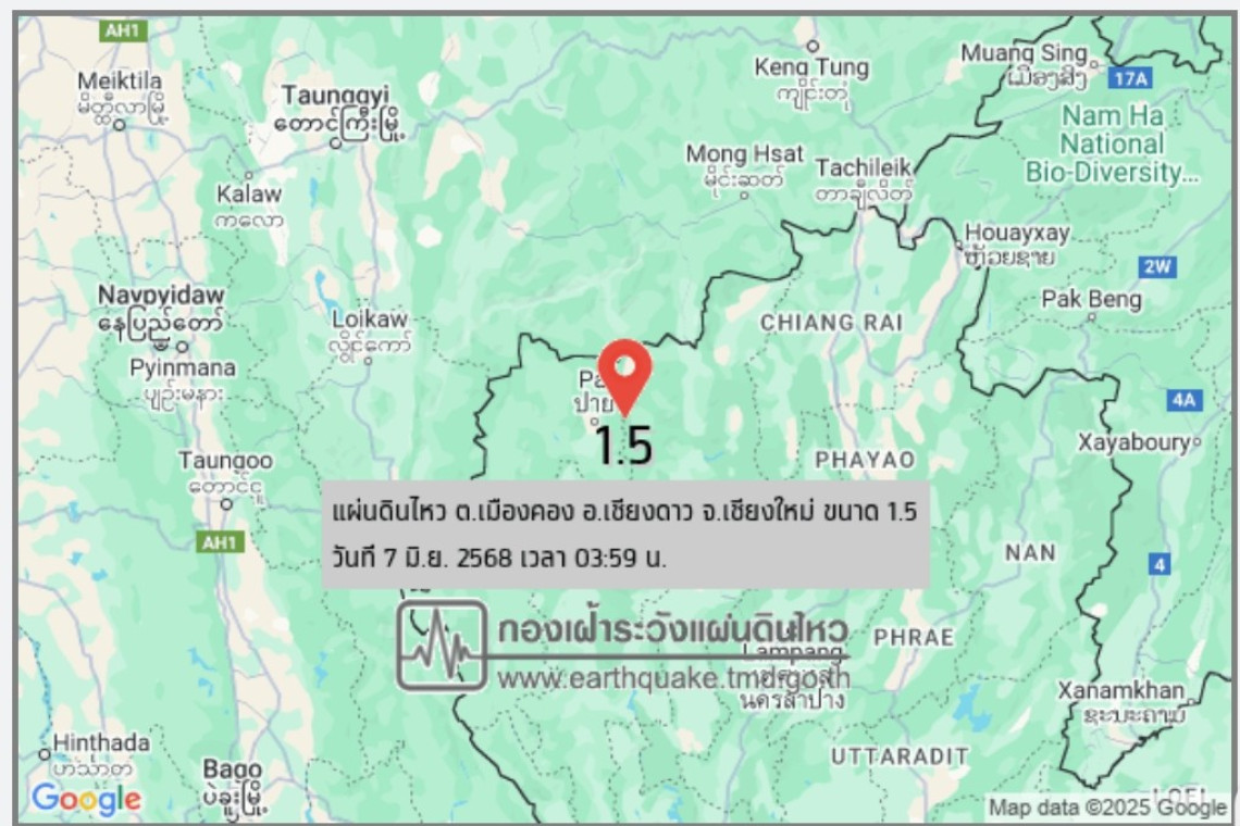 วันที่ 7 มิ.ย.68 - กองเฝ้าระวังแผ่นดินไหวประเทศไทย กรมอุตุนิยมวิทยา รายงานความเคลื่อนไหวแผ่นดินไหวตามข้อมูลบันทึกการเกิดเหตุแผ่นดินไหวให้ทราบกันของตลอดกลางดึกของเวลา 00.00-ล่าสุดณ เวลา06.00น.ว่า เวลา03:59น.ได้เกิดเหตุแผ่นดินไหวกลางดึกประเดิมรับขวัญเช้าวันนี้ ขนาดความรุนแรง 1.5 ริกเตอร์ ความลึก 2 กม.ที่ต.เมืองคอง อ.เชียงดาว จ.เชียงใหม่.
