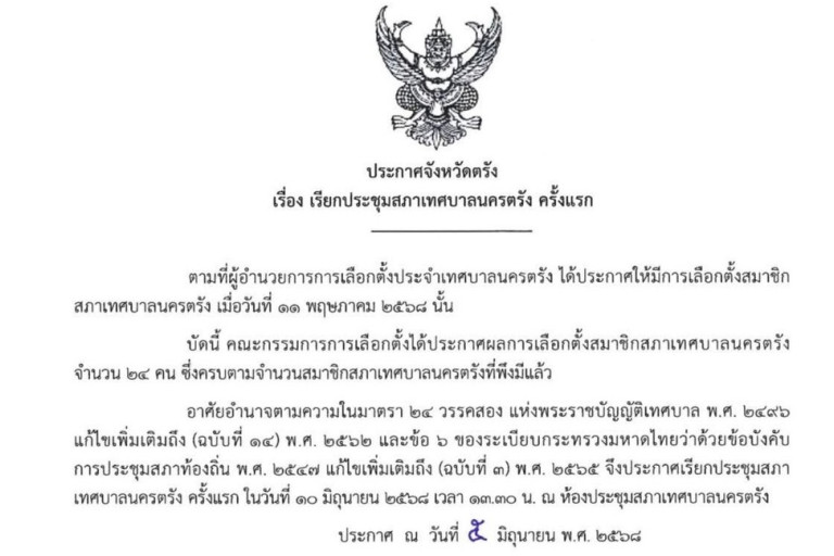 อาศัยอำนาจตามความในมาตรา ๒๔ วรรคสอง แห่งพระราชบัญญัติเทศบาล พ.ศ. ๒๔๙๖ แก้ไขเพิ่มเติมถึง (ฉบับที่ ๑๔) พ.ศ. ๒๕๖๒ และข้อ ๖ ของระเบียบกระทรวงมหาดไทยว่าด้วยข้อบังคับการประชุมสภาท้องถิ่น พ.ศ. ๒๕๔๗ แก้ไขเพิ่มเติมถึง (ฉบับที่ ๓) พ.ศ. ๒๕๖๕ จึงประกาศเรียกประชุมสภาเทศบาลนครตรัง ครั้งแรก ในวันที่ ๑๐ มิถุนายน ๒๕๖๘ เวลา ๑๓.๓๐ น. ณ ห้องประชุมสภาเทศบาลนครตรัง