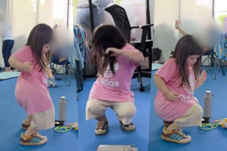 ในคลิปน้องแอบิเกลสวมเสื้อสีชมพูสุดสดใส ขณะกำลังหยิบของเล่นและขวดน้ำบนพื้น แต่สิ่งที่ทำให้ชาวเน็ตอดยิ้มตามไม่ได้ คือจังหวะการเต้นที่เป็นธรรมชาติ ราวกับมีดนตรีในหัวใจ พร้อมกับท่าก้มที่เป๊ะราวนักเต้นมืออาชีพ