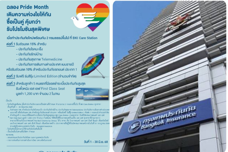 บริษัท กรุงเทพประกันภัย จำกัด (มหาชน) ให้ความสำคัญกับการเคารพสิทธิมนุษยชน สนับสนุนในสิทธิ เสรีภาพ และความเท่าเทียมกันของคนทุกกลุ่มทุกเพศทุกวัย พร้อมเปิดกว้างด้านความหลากหลาย ยอมรับในความแตกต่าง ทั้งทางด้านเชื้อชาติ ศาสนา วัฒนธรรม อัตลักษณ์ส่วนบุคคล และในโอกาสเดือนแห่งความภาคภูมิใจ (Pride Month) บริษัทฯ ขอร่วมเฉลิมฉลองและสนับสนุนความหลากหลายของคนทุกกลุ่ม เพื่อเป็นส่วนหนึ่งในการขับเคลื่อนสังคมที่เท่าเทียมและเป็นธรรมสำหรับทุกคน โดยการจัดโปรโมชันพิเศษในเทศกาล Pride Month เมื่อทำประกันภัยใหม่พร้อมกัน 2 กรมธรรม์ขึ้นไปที่ BKI Care Station ทุกสาขา ตั้งแต่วันที่ 1 - 30 มิถุนายน 2568 รับสิทธิพิเศษ ดังนี้