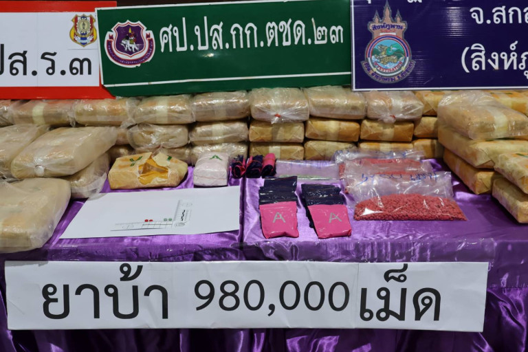 เมื่อเวลา 14.00 น.วันที่ 13 มิถุนายน 2568 ที่ กก.ตชด.23 ต่ายศรีสกุลวงศ์ อ.เมือง จ.สกลนคร นายชูศักดิ์ รู้ยิ่ง ผวจ.สกลนคร ร่วมกับ นายเอกภพ โสภณ ปลัดจังหวัดสกลนคร น.ส.จิราภรณ์ เบิกบานดี นอภ.เมืแงสกลนคร พ.อ.ศิวดล ยาคล้าย ผบ.ร.3 พ.ต.อ.อัษดิน สมศรี รอง ผบก.ภ.จว.สกลนคร พ.ต.อ.วุทธยา สิงห์กิ้ง ผกก.ตชด. 23 ค่ายศรีสกุลวงศ์ พ.ต.อ.พีรเดช เจริญเดช ผกก.สภ.ตาดโตน พร้อมชุดจับกุมได้ร่วมกันแถลงข่าวจับกุมตรวจยึดยาเสพติดประเภท 1 (ยาบ้า) รวม 980,000 เม็ด ในพื้นที่ ต.ห้วยยาง อ.เมืองจ.สกลนคร การจับกุมครั้งนี้ สืบเนื่องมาจากเจ้าหน้าที่ชุดปราบปรามยาเสพติด กก.ตชด. 23 สืบสวนจนทราบว่า นายเกรียงไกร หรือภพ อายุ 40 ปี ราษฎร บ.ห้วยยาง ต.ห้วยยาง อ.เมือง จ.สกลนคร มีพฤติการณ์เป็นผู้ขนลำเลียงยาเสพติด และจะใช้รถยนต์เก๋งยี่ห้อ TOYOTA รุ่น VIOS ทะเบียน กว 4218 ลพบุรี เป็นพาหนะเดินทางไปขนลำเลียงยาบ้าไปกระจายส่งให้กับเครือข่ายในพื้นที่ตอนใน และสืบทราบว่านายเกรียงไกรฯ จะทำการลำเลียงยาบ้าจากพื้นที่แนวชายแดน เข้ามาพักไว้ที่บ้านพักในพื้นที่ บ.ห้วยยาง ต.ห้วยยาง เพื่อรอลำเลียงไปส่งต่อให้กับลูกค้าในเขตพื้นที่ตอนใน จึงได้รายงานให้ผู้บังคับบัญชาทราบตามลำดับชั้น และประชุมวางแผน พร้อมกับประสานการปฏิบัติไปที่ ฝ่ายปกครอง จ.สกลนคร เพื่อตรวจค้นจับกุม