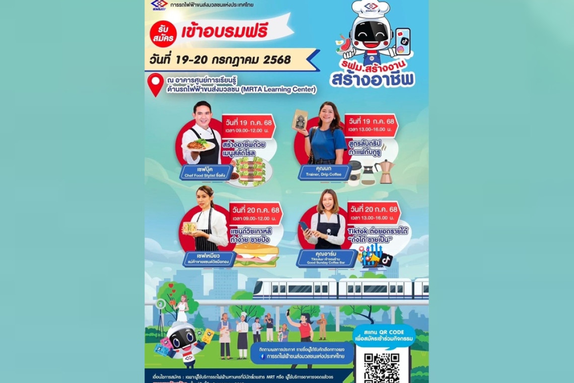 รฟม. ชวนทุกท่าน สร้างงาน เสริมทักษะ เพิ่มรายได้ กับเวิร์กชอปเรียนรู้อาชีพจากตัวจริง ทั้งเชฟ บาริสต้า และ TikToker ในกิจกรรม “รฟม. สร้างงาน สร้างอาชีพ” ชวนพบกับกูรูทักษะอาชีพ 4 ท่าน ผู้มากประสบการณ์ ที่จะพาทุกคนเติมทักษะอาชีพแบบไม่กั๊ก เปิดรับสมัครฟรี สำหรับลูกค้าที่ใช้บริการ MRT และอาคารจอดแล้วจร ของ รฟม. เท่านั้น!! รับสมัครจำนวนจำกัด สมัครด่วนที่ลิงก์นี้เลย! https://forms.gle/pGAstwYjFn73j8iV9 ในระหว่างวันที่ 19 - 20 กรกฎาคม 2568 ณ ศูนย์การเรียนรู้การรถไฟฟ้าขนส่งมวลชนแห่งประเทศไทย (MRTA Learning Center)