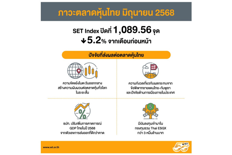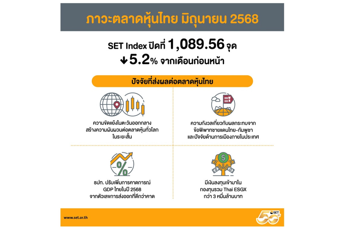 -ณ 30 มิถุนายน 2568 SET Index ปิดที่ 1,089.56 จุด ปรับลดลง 5.2% จากเดือนก่อนหน้า ซึ่งเป็นการปรับลดลงมากกว่าตลาดหลักทรัพย์ส่วนใหญ่ในภูมิภาค ส่งผลให้ตั้งแต่ต้นปีจนถึงสิ้นเดือนมิถุนายน 2568 ปรับลดลง 22.2%