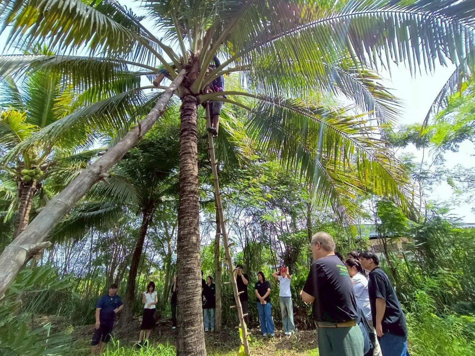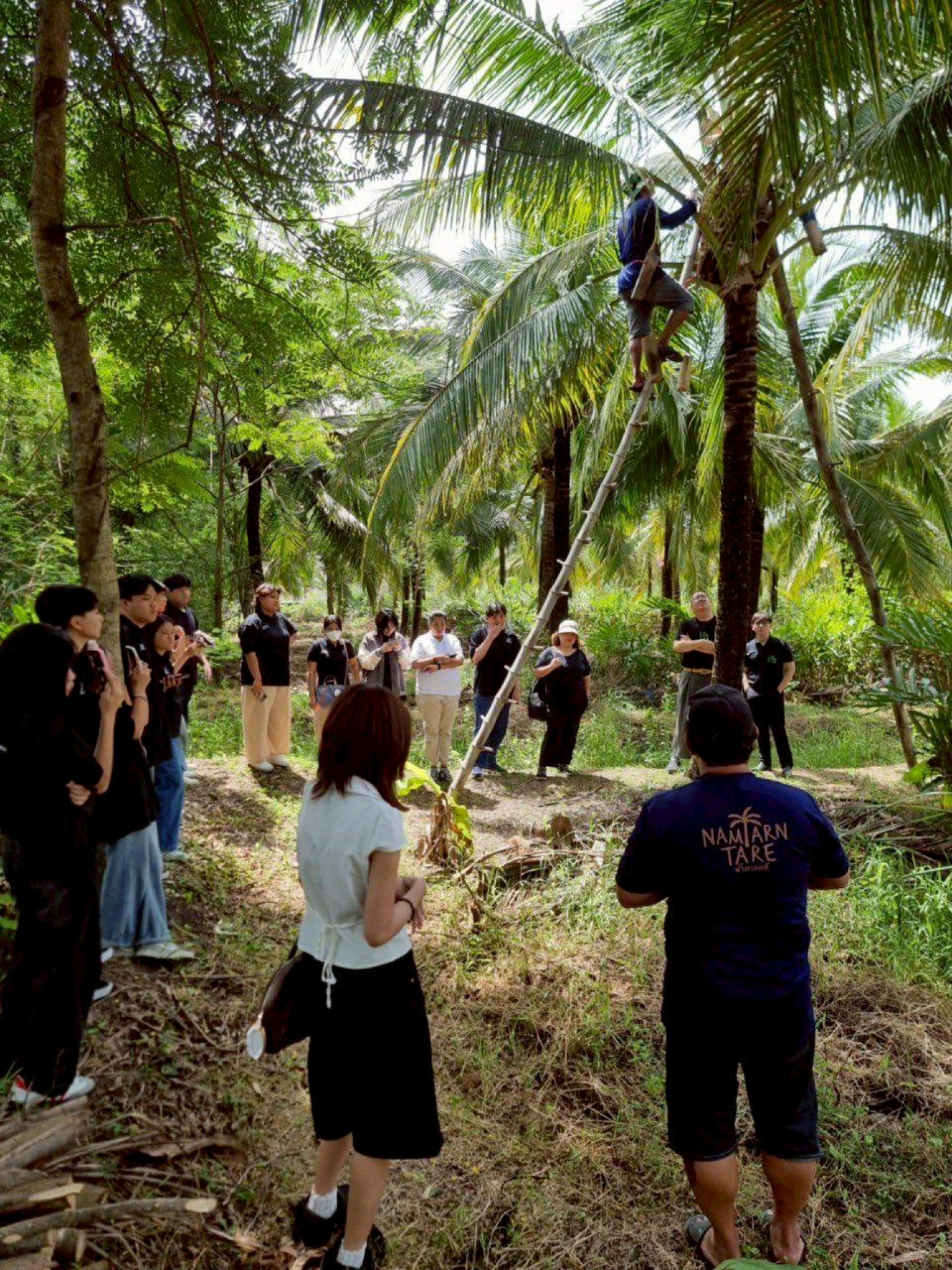 นอกจากนี้ นักศึกษายังได้เห็นขั้นตอนการทำน้ำตาลดอกมะพร้าวตั้งแต่การเก็บน้ำหวานจนถึงการเคี่ยวน้ำตาลมะพร้าวด้วยกรรมวิธีพื้นบ้าน ซึ่งไม่เพียงสอดแทรกภูมิปัญญาท้องถิ่น แต่ยังเปิดมุมมองใหม่ที่เกี่ยวกับผลกระทบที่มีต่อสิ่งแวดล้อมและความยั่งยืนของระบบอาหาร สวนมะพร้าวแห่งนี้จึงไม่ใช่เพียงแค่ฟาร์ม แต่เป็นห้องเรียนที่มีชีวิตสำหรับนักศึกษาในสายอาชีพผู้ประกอบอาหารมืออาชีพ
