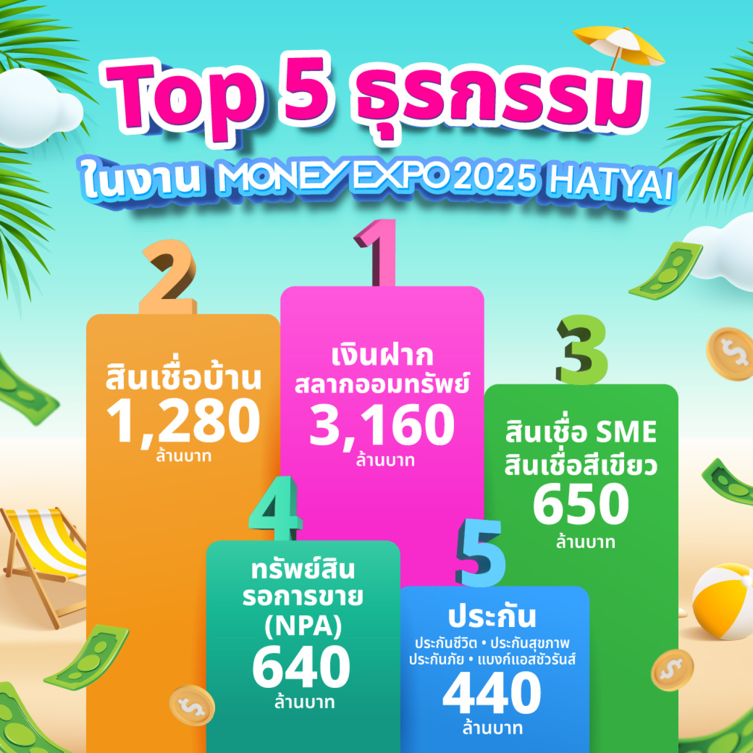 งานมหกรรมการเงินหาดใหญ่ ครั้งที่ 15 Money Expo 2025 Hatyai จัดโดยวารสารการเงินธนาคาร วันที่ 4-6 กรกฎาคม 2568 มียอดธุรกรรมรวม 3 วัน กว่า 6,900 ล้านบาท ประชาชนแห่ฝากเงิน/ซื้อสลากออมทรัพย์ ดันยอดพุ่งอันดับ 1 กว่า 3,160 ล้านบาท สินเชื่อบ้านชูโปรฯ ดอกเบี้ย 0% ติดอันดับ 2 กว่า 1,280 ล้านบาท ผู้ประกอบการเอสเอ็มอียื่นขอกู้ วงเงินรวมกว่า 650 ล้านบาท