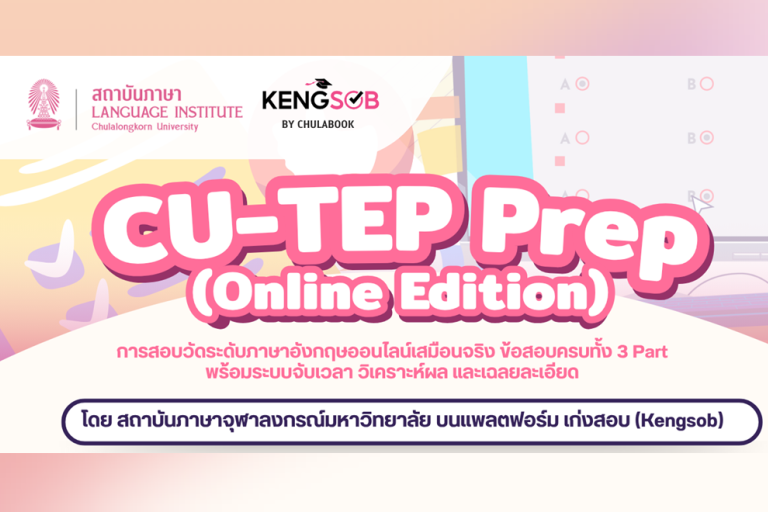 ศูนย์หนังสือจุฬาลงกรณ์มหาวิทยาลัย จัดสอบ CU-TEP Prep (Online Edition) ระบบการสอบภาษาอังกฤษออนไลน์เสมือนจริง ครบทั้ง 3 พาร์ต โดย สถาบันภาษาจุฬาฯ บนแพลตฟอร์ม เก่งสอบ (Kengsob) สามารถสอบได้ทุกที่ เข้าทำข้อสอบออนไลน์จากที่ไหนก็ได้ ข้อสอบครบ 3 พาร์ต (Listening, Reading, Writing) รวม 120 ข้อ ในเวลา 130 นาที มีการจัดอันดับคะแนนในแต่ละรอบ หลังสอบเสร็จ มีเฉลยพร้อมคำอธิบาย วิเคราะห์ผล สรุปจุดแข็ง–จุดอ่อน สามารถทำข้อสอบซ้ำได้ ไม่จำกัด ภายใน 30 วัน ผลสอบใช้เพื่อการประเมินตนเองเท่านั้น ไม่สามารถนำไปใช้อ้างอิงได้ จัดสอบทั้งหมด 4 รอบ