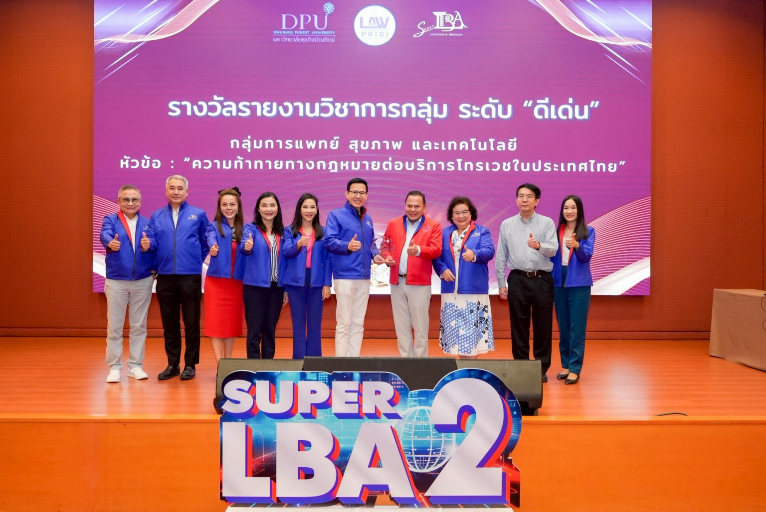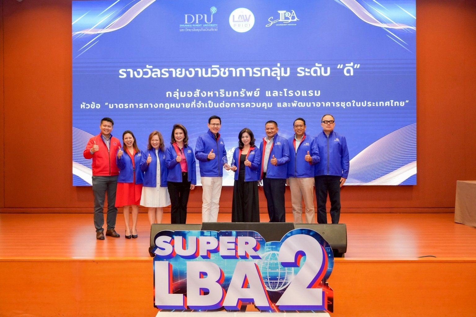 ภายในงานยังมีการจัดพิธีมอบรางวัลรายงานวิชาการหลักสูตร Super LBA ของรุ่นที่ 1 ซึ่งเป็นส่วนหนึ่งของการศึกษาที่ผู้เข้าร่วมต้องจัดทำรายงานกลุ่มวิชาการที่แบ่งออกเป็น 4 กลุ่มตามสาขาอาชีพ อาทิ อสังหาริมทรัพย์, การแพทย์, การเงิน, และอาหาร โดยมีอาจารย์ที่ปรึกษา และนำเสนอต่อคณะกรรมการวิชาการ นำโดยอาจารย์ ดร.สุทธิพล ทวีชัยการ ประธานกรรมการหลักสูตรและคณบดีคณะนิติศาสตร์ปรีดี พนมยงค์ก่อนจะปิดท้ายด้วยกิจกรรมสานสัมพันธ์ "พี่พบน้องรุ่นที่ 2: รับน้องด้วยใจ พาไปด้วยรัก" เพื่อสานสัมพันธ์และสร้างเครือข่ายระหว่างผู้บริหารองค์กรชั้นนำของประเทศทั้งสองรุ่น อันจะเป็นกำลังสำคัญในการสร้างสรรค์ธุรกิจไทยให้เติบโต