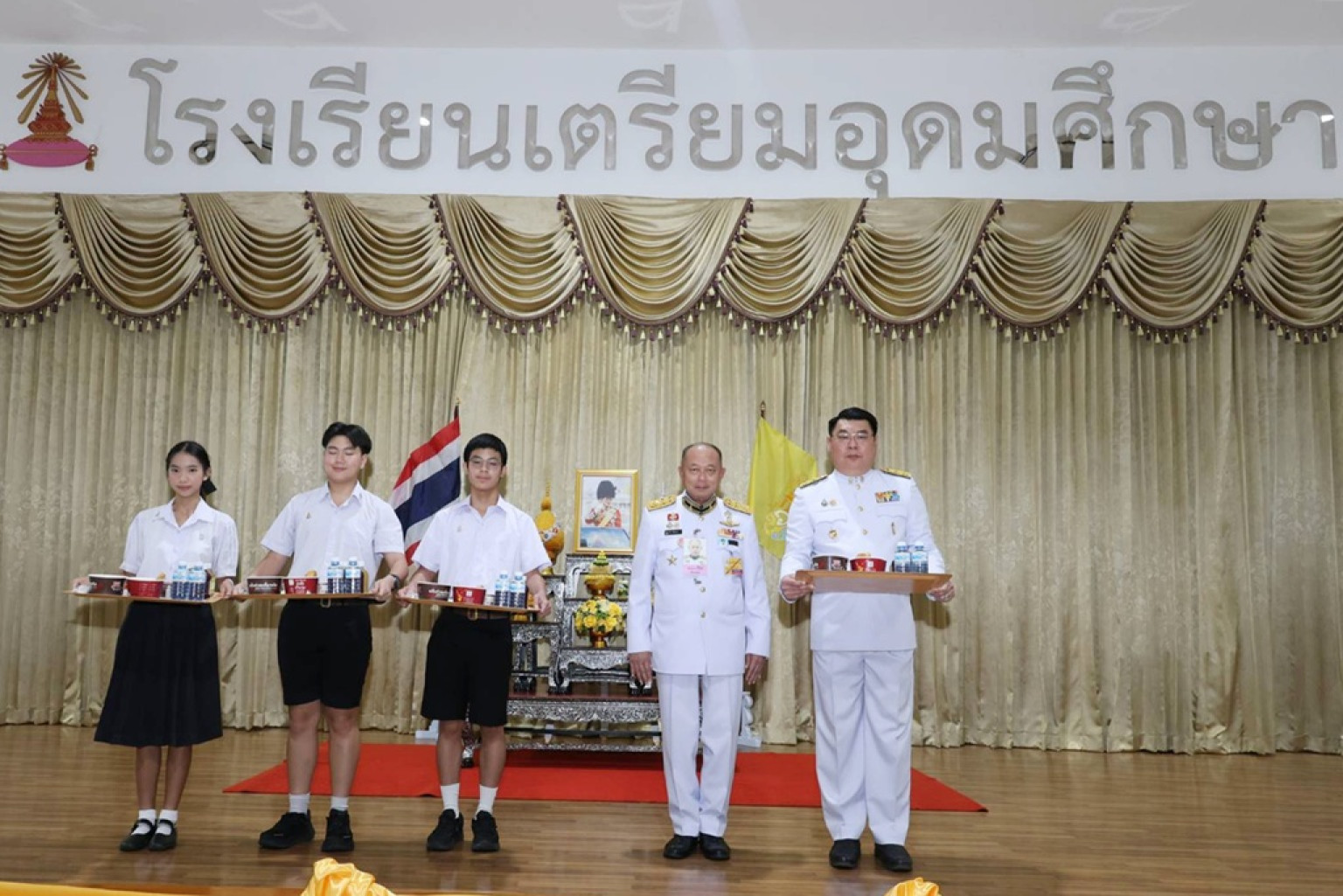 วันที่ 18 ก.ค.68 เวลา 09.48 น. พระบาทสมเด็จพระเจ้าอยู่หัว ทรงพระกรุณาโปรดเกล้าโปรดกระหม่อมให้ พลอากาศตรี ธีระ เชียงทอง เป็นประธานเชิญอาหารพระราชทานไปพระราชทานเลี้ยงแก่นักเรียน คณะครู บุคลากร และเจ้าหน้าที่ โรงเรียนเตรียมอุดมศึกษา เขตปทุมวัน กรุงเทพมหานคร จำนวนรวม 4,761 คน เนื่องในโอกาสวันเฉลิมพระชนมพรรษา วันที่ 28 กรกฎาคม 2568 เพื่อให้นักเรียน คณะครู บุคลากร และเจ้าหน้าที่ ได้รับประทานอาหารที่ดีมีคุณค่าตามหลักโภชนาการ อันจะส่งผลให้มีสุขอนามัยที่ดี มีสุขภาพร่างกายที่แข็งแรง และมีสุขภาพจิตที่ดี สำหรับรายการอาหารในวันนี้ ประกอบด้วย ข้าวมันไก่ ข้าวขาหมู ข้าวหมูแดงหมูกรอบ ข้าวไก่เทอริยากิ ข้าวเหนียวไก่ย่าง ก๋วยเตี๋ยวเรือ ก๋วยเตี๋ยวไก่ ก๋วยเตี๋ยวเย็นตาโฟ ก๋วยจั๊บน้ำข้น ก๋วยเตี๋ยวบะหมี่เกี๊ยวหมูแดง รวมทั้งเครื่องดื่ม น้ำเก๊กฮวย น้ำกระเจี๊ยบ และน้ำดื่ม จากโครงการส่วนพระองค์ สวนจิตรลดา เป็นต้น