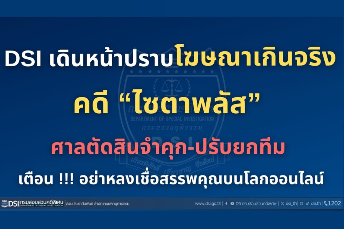 วันที่ 20 ก.ค.68 กรมสอบสวนคดีพิเศษ โดยกองคดีเทคโนโลยีและสารสนเทศ เผยแพร่คำพิพากษาศาลทรัพย์สินทางปัญญาและการค้าระหว่างประเทศกลาง เมื่อวันที่ 16 พฤษภาคม 2568 ในคดีหมายเลขดำที่ อ. 349/2568 และหมายเลขแดงที่ อ. 297/2568 ซึ่งเกี่ยวข้องกับความผิดตามพระราชบัญญัติว่าด้วยการกระทำความผิดเกี่ยวกับคอมพิวเตอร์และพระราชบัญญัติอาหาร กรณีโฆษณาอาหารเสริมเกินจริง “SAITA Plus” หรือ “ไซตาพลัส” ที่อ้างสรรพคุณสามารถรักษาโรคตาได้ ศาลพิพากษาว่าจำเลยทั้ง 6 ราย ซึ่งประกอบด้วยนิติบุคคล 2 ราย และบุคคล 4 ราย มีความผิดฐานร่วมกันหลอกลวงนำเข้าข้อมูลอันเท็จเข้าสู่ระบบคอมพิวเตอร์ ร่วมกันโฆษณาอาหารฝ่าฝืนกฎหมาย ศาลมีพิพากษาจำคุกจำเลยที่ 2 - 6 คนละ 3 ถึง 5 ปี และปรับรวมตั้งแต่ 110,000 - 220,000 บาทเนื่องจากจำเลยทั้งหมดให้การรับสารภาพ ศาลจึงลดโทษกึ่งหนึ่งตามประมวลกฎหมายอาญา สั่งให้จำเลยที่ 1 ชำระค่าปรับ 55,000 บาท จำเลยที่ 2 จำเลยที่ 3 และจำเลยที่ 4 จำคุก 18 เดือน ปรับคนละ 55,000 บาท จำเลยที่ 5 จำคุก 36 เดือน ปรับ 110,000 บาท จำเลยที่ 6 จำคุก 18 เดือน ปรับ 110,000 บาท โทษจำคุกรอการลงโทษ 1 ปี
