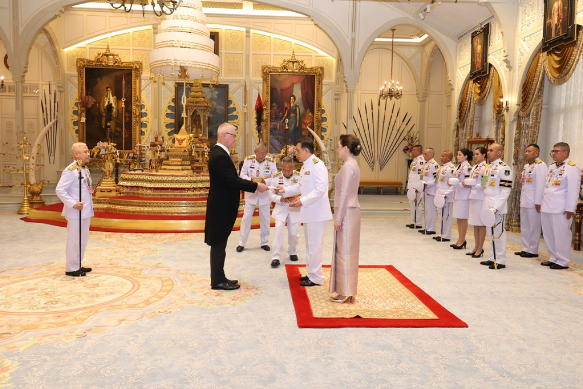 วันที่ 20 กรกฎาคม 2568 เวลา 17.26 น. ผู้สื่อข่าวรายงาน ว่า พระบาทสมเด็จพระเจ้าอยู่หัว และสมเด็จพระนางเจ้า ฯ พระบรมราชินี เสด็จออก ณ พระที่นั่งอัมพรสถาน พระราชวังดุสิต พระราชทานพระบรมราชวโรกาสให้ เอกอัครราชทูตต่างประเทศประจำประเทศไทย เฝ้าทูลละอองธุลีพระบาท ถวายพระราชสาส์นตราตั้ง และอักษรสาส์นตราตั้ง