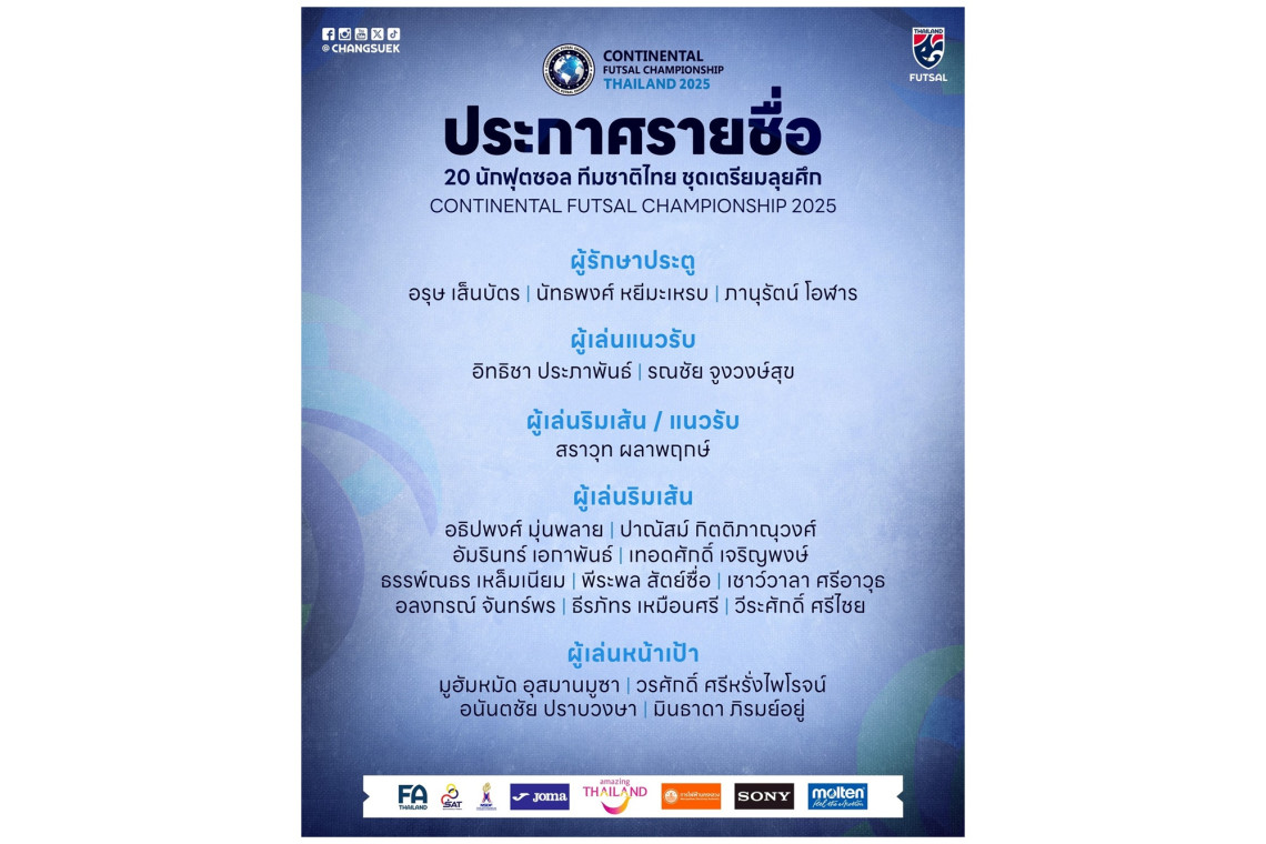สมาคมกีฬาฟุตบอลแห่งประเทศไทย ในพระบรมราชูปถัมภ์ ประกาศรายชื่อ 20 นักฟุตซอลชายทีมชาติไทย สำหรับการเก็บตัวฝึกซ้อม เพื่อเตรียมลงแข่งขันรายการ Continental Futsal Championship 2025 ระหว่างวันที่ 29 กรกฎาคม – 3 สิงหาคม 2568 ณ โรงยิมเนเซี่ยม สนามกีฬากลางจังหวัดนนทบุรี ภายใต้การคุมทีมของ มิเกล โรดริโก้ หัวหน้าผู้ฝึกสอนชาวสเปน