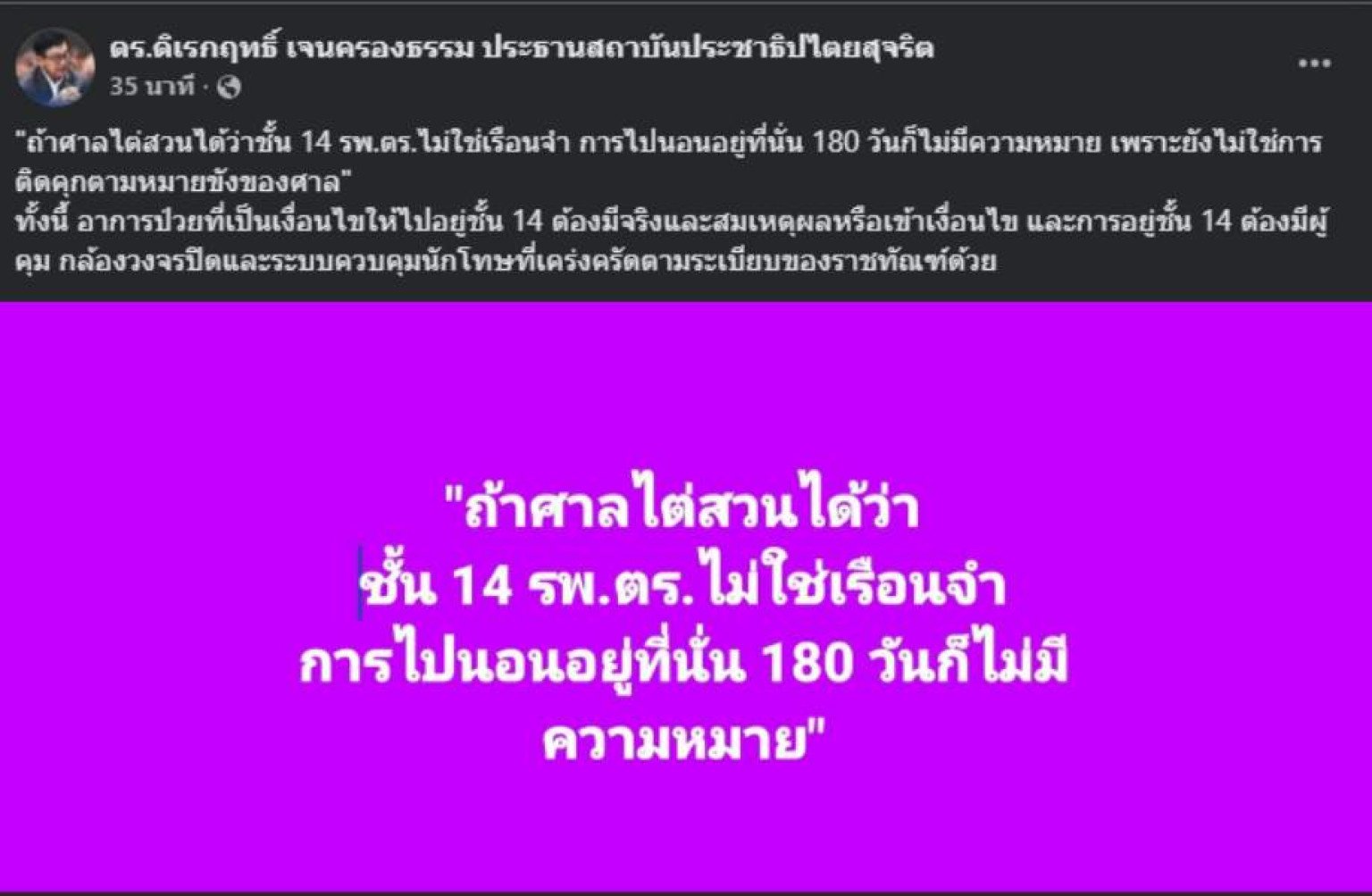 "ถ้าศาลไต่สวนได้ว่าชั้น 14 รพ.ตร.ไม่ใช่เรือนจำ การไปนอนอยู่ที่นั่น 180 วันก็ไม่มีความหมาย เพราะยังไม่ใช่การติดคุกตามหมายขังของศาล"